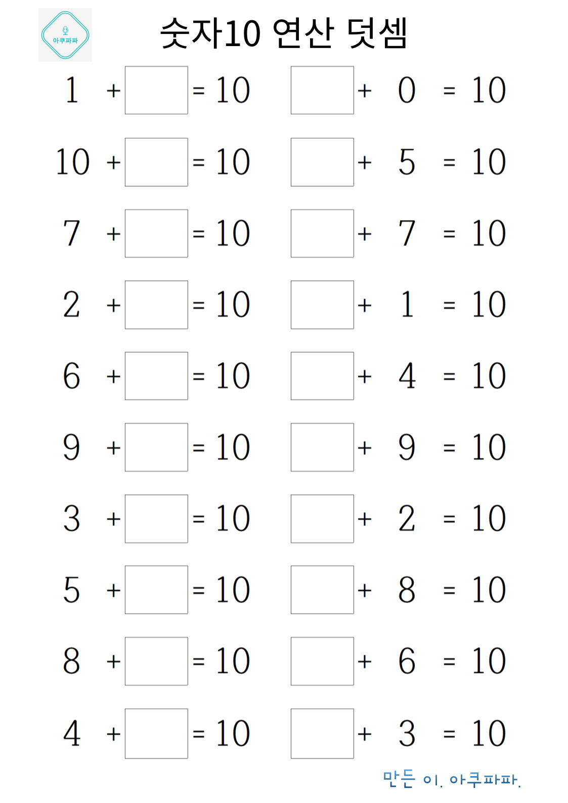 한자릿수인 0부터 9까지 어떤 수를 더해 10을 만들 수 있는지 학습해주세요.