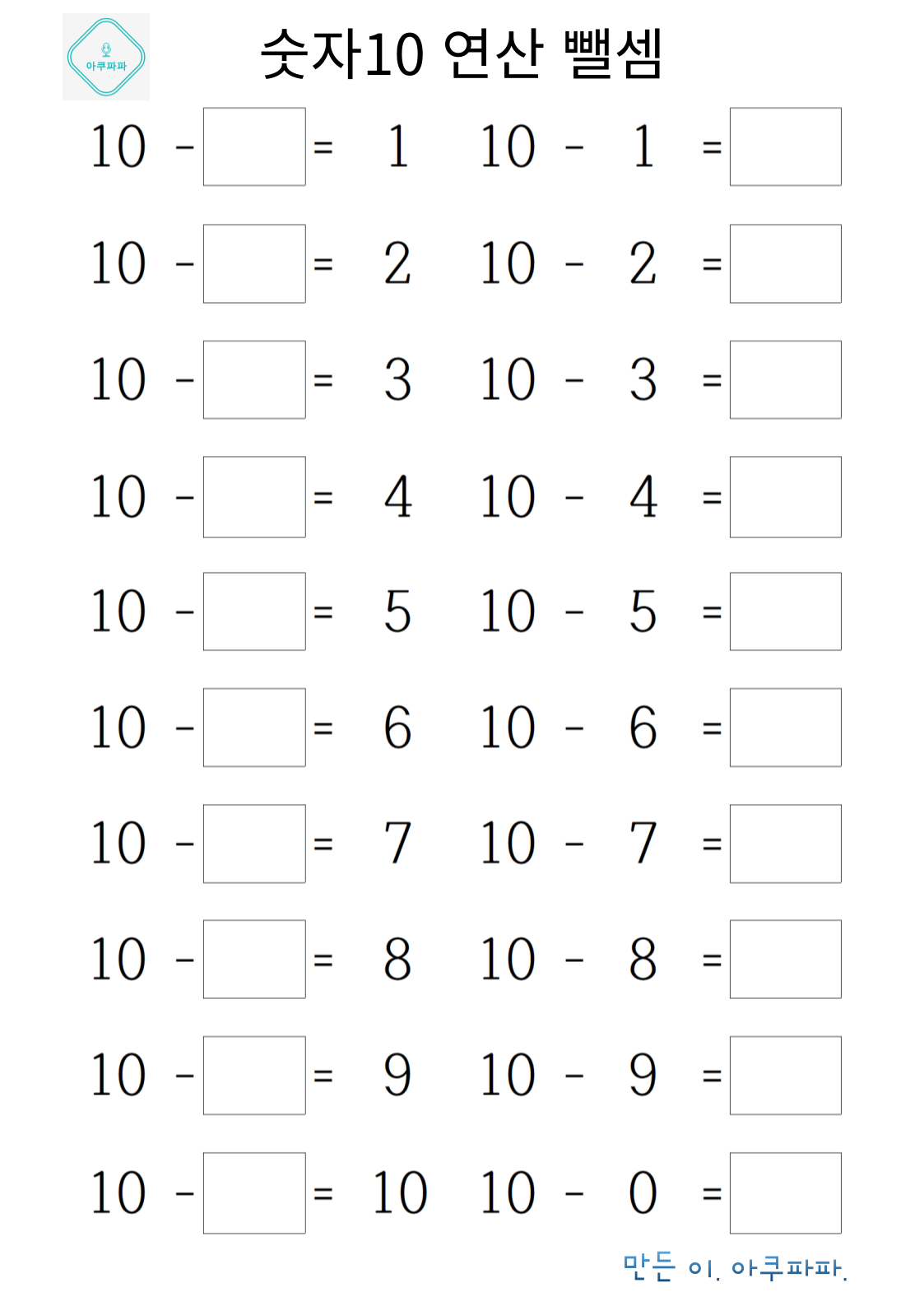 덧셈과 마찬가지로 10에서 빼면 무엇이 남는지, 여러번 반복하며 암기와 이해를 동시에 학습합니다.