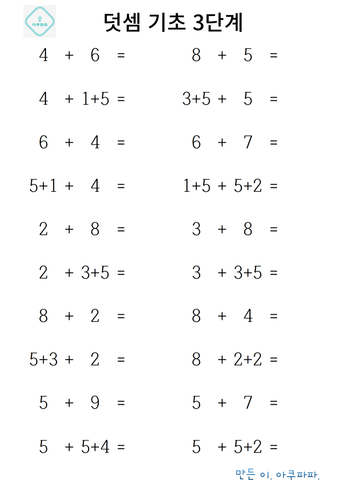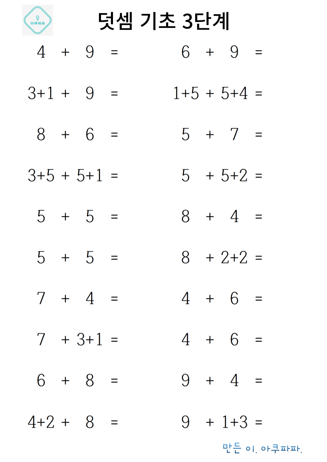 한자릿 수 덧셈 기초 2단계기초적인 덧셈을 잘 풀 수 있다면 다음 단계 수준의 덧셈을 풀어보세요. 약간의 숫자만 더 커졌을 뿐, 한 자릿수의 셈이기에 그리 어렵지 않게 풀 수 있을 거에요. 값