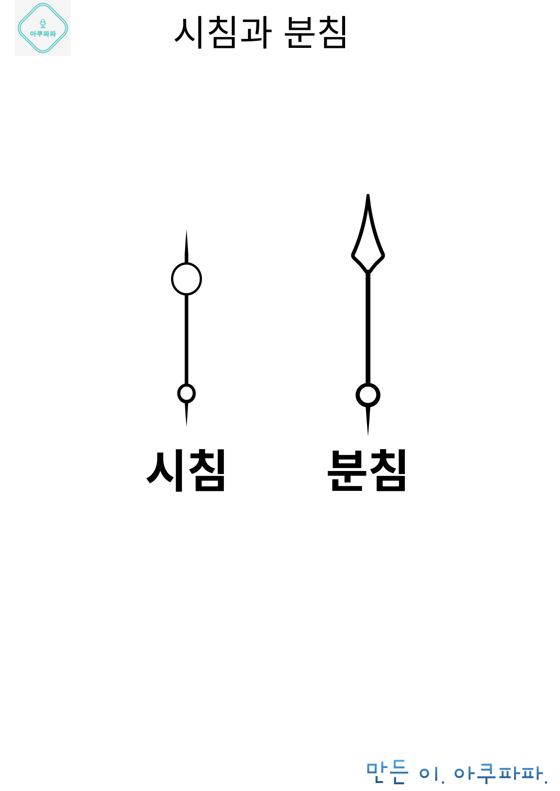 매시 정각과, 1부터 12까지의 각 숫자가 시간이 아닌 분(分) 일때는 왜 5의 배수가 되는지 그림을 보고 이해해 봅니다.