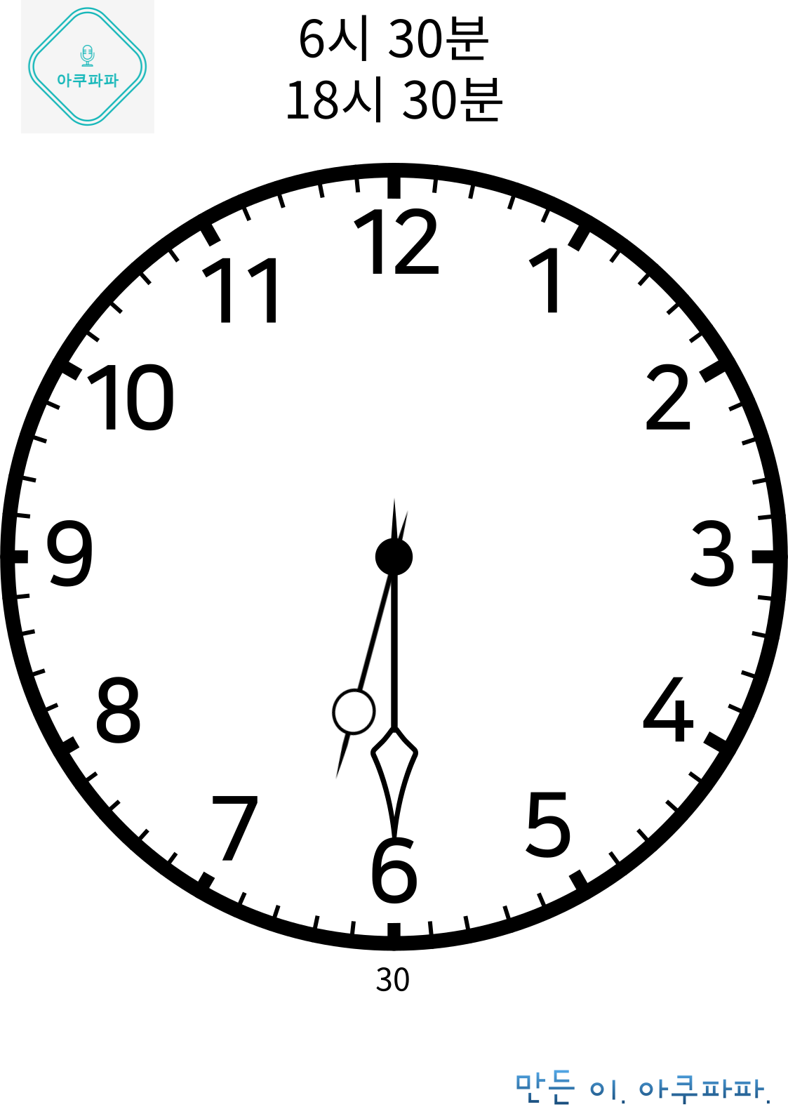 이번엔 30분 단위로, 분침이 6(30분)에 있을때 시침은 어디에 있는지 배워 봅니다.