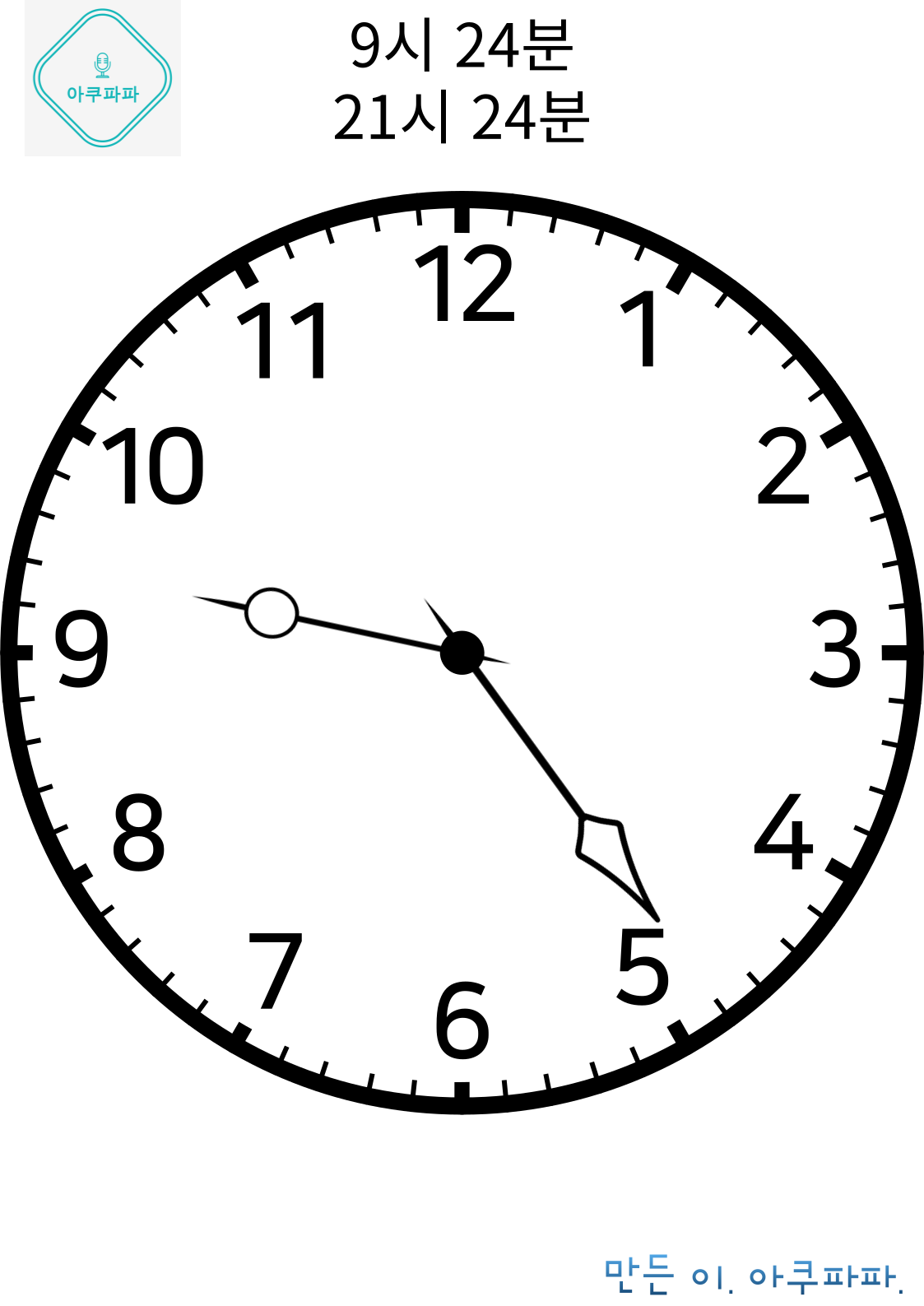 9시 혹은 21시이며, 한 칸 한칸 정해진 위치가 명확한 분침과 대략 알 수 있는 시침의 위치를