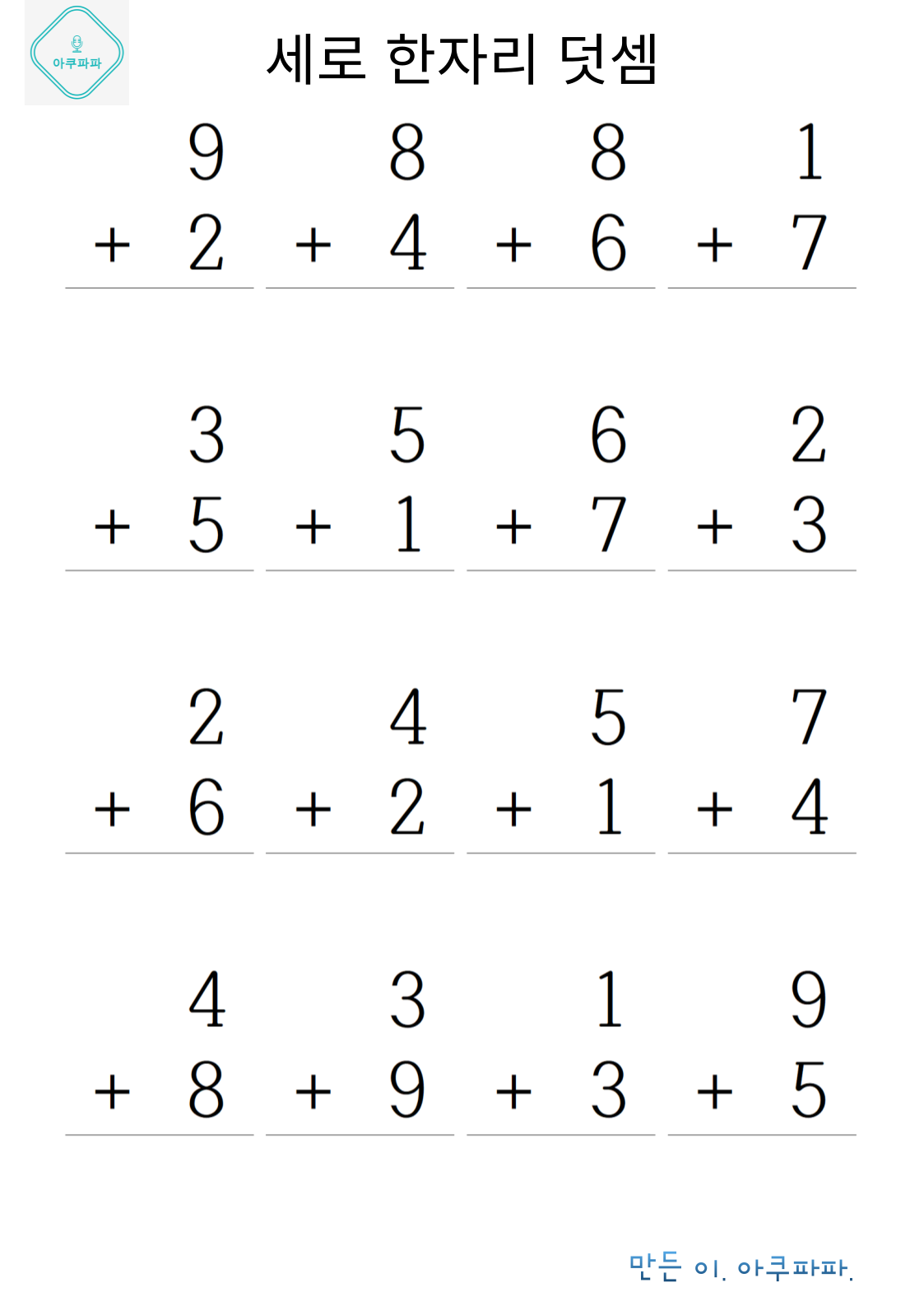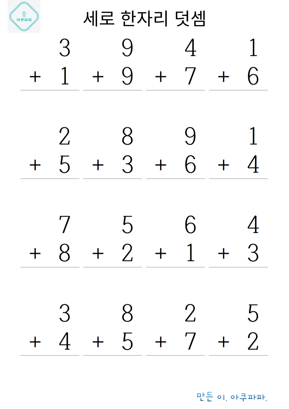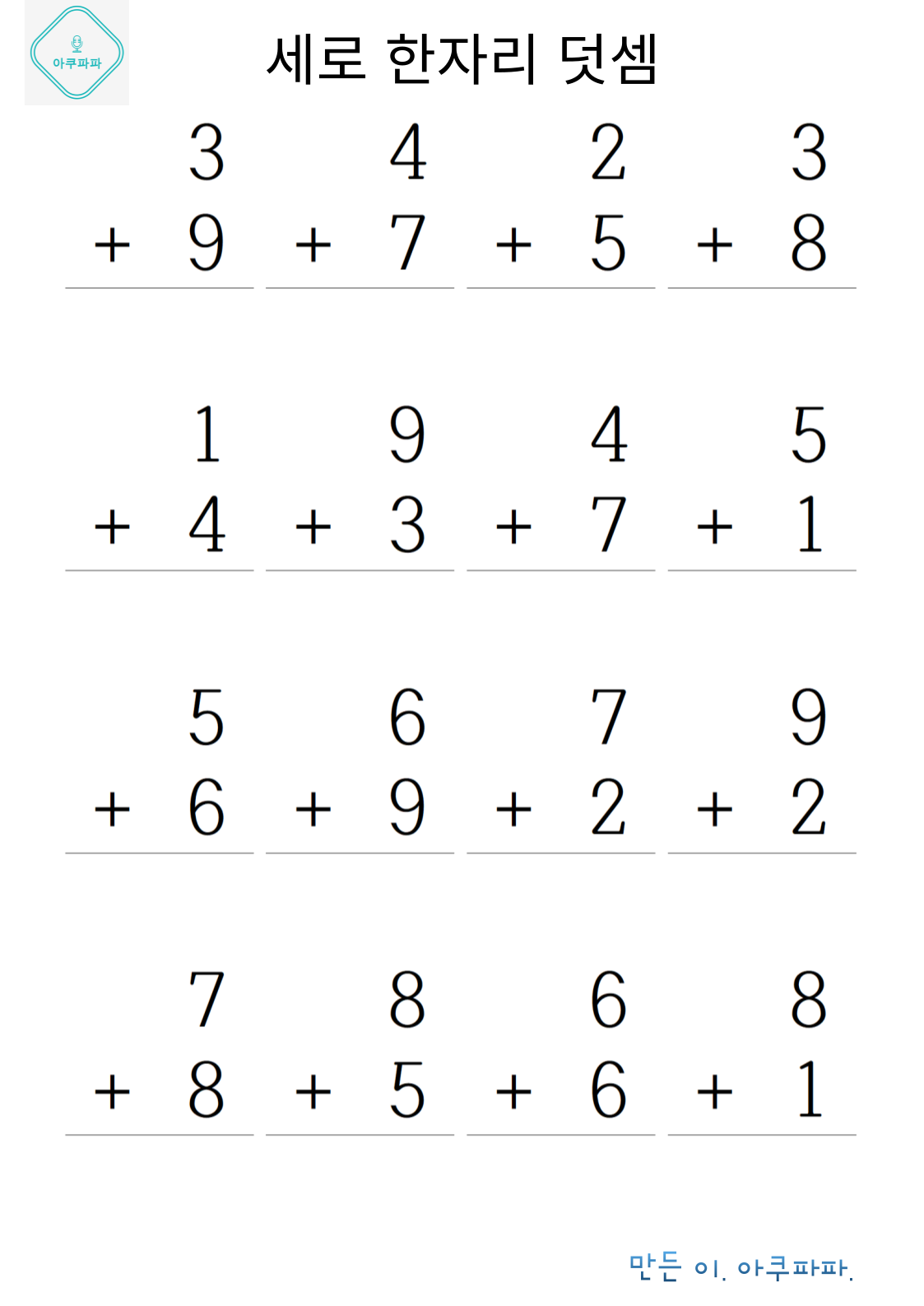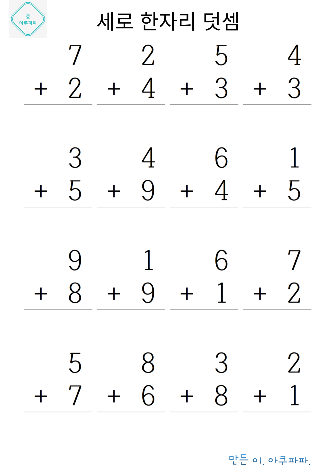한자릿 수 기초 덧셈손으로 계산하며 풀어 볼 수 있을 정도의 난이도로 이제 막 셈을 배운 유치부 난이도 정도로 매우 쉽게 만들었습니다. 숫자만보고 풀기가 아직 어렵다면 손으로 셈을 하