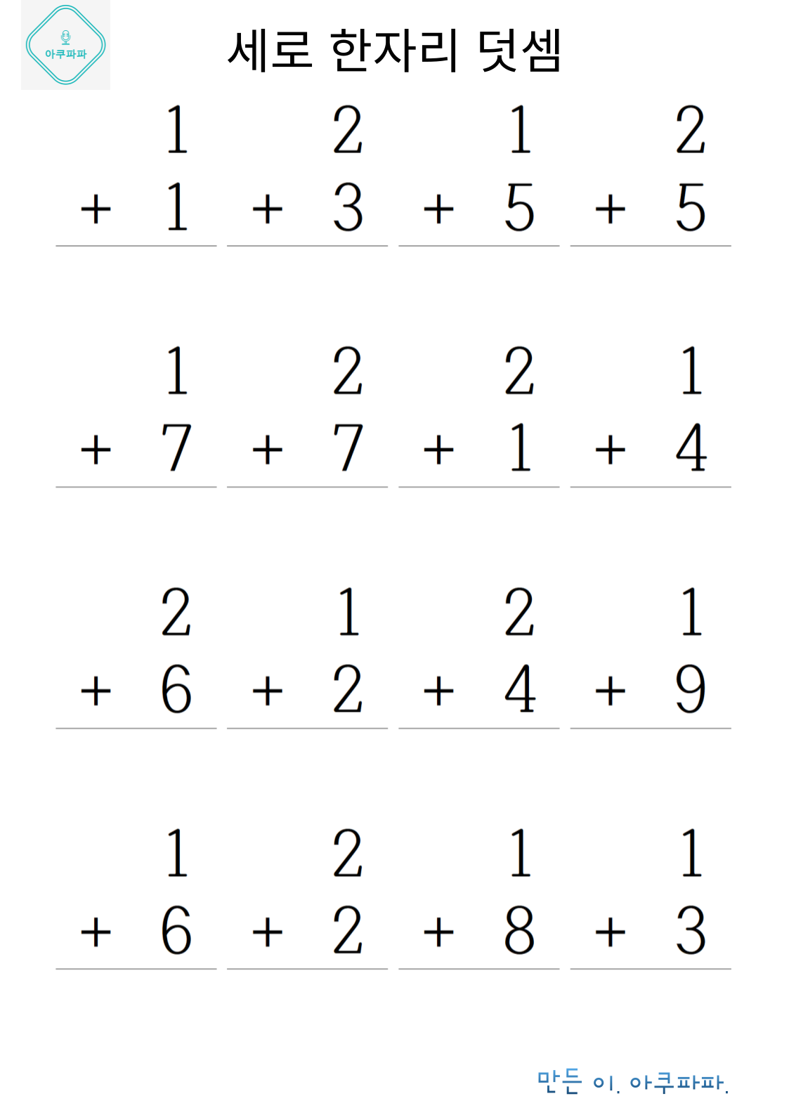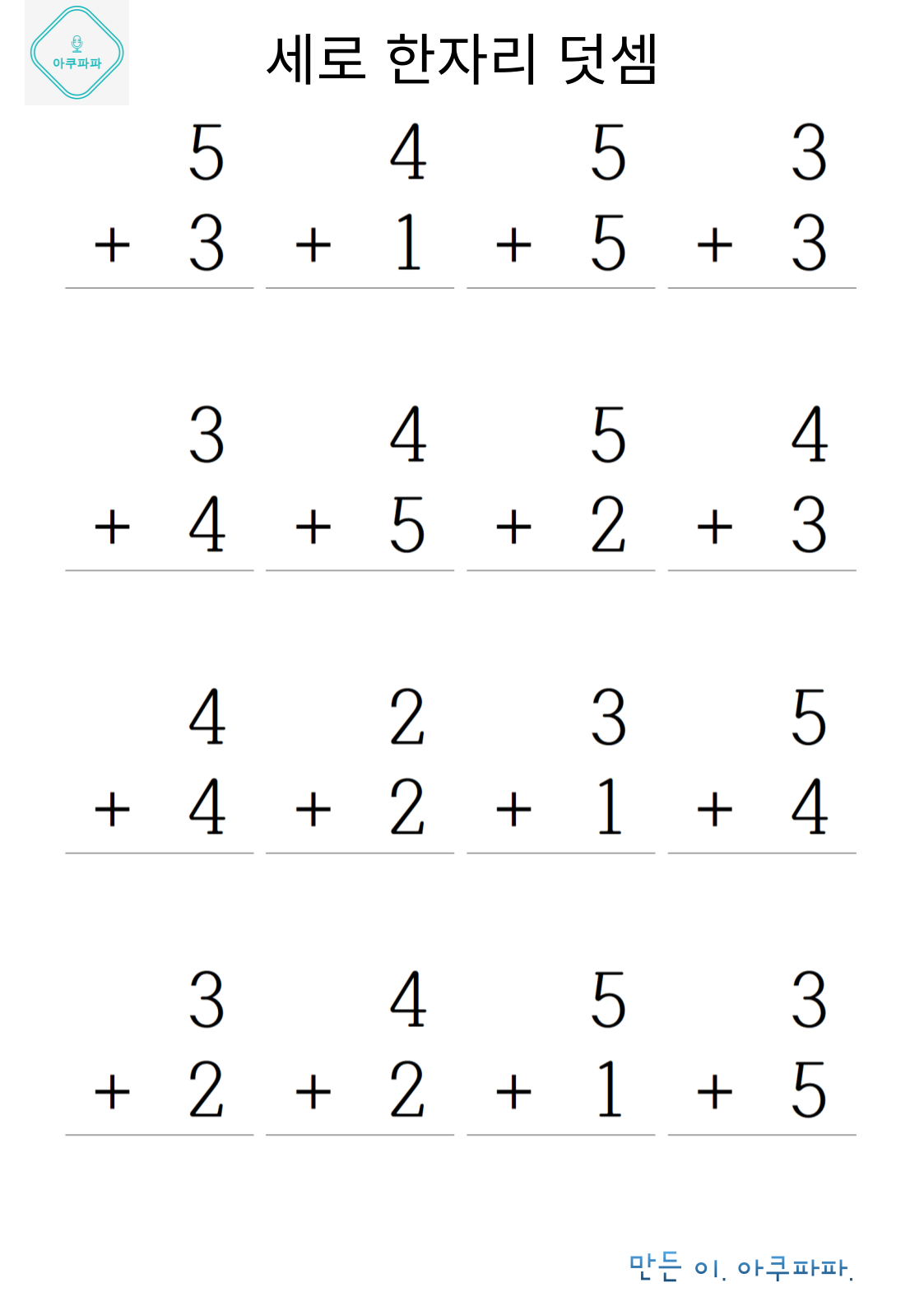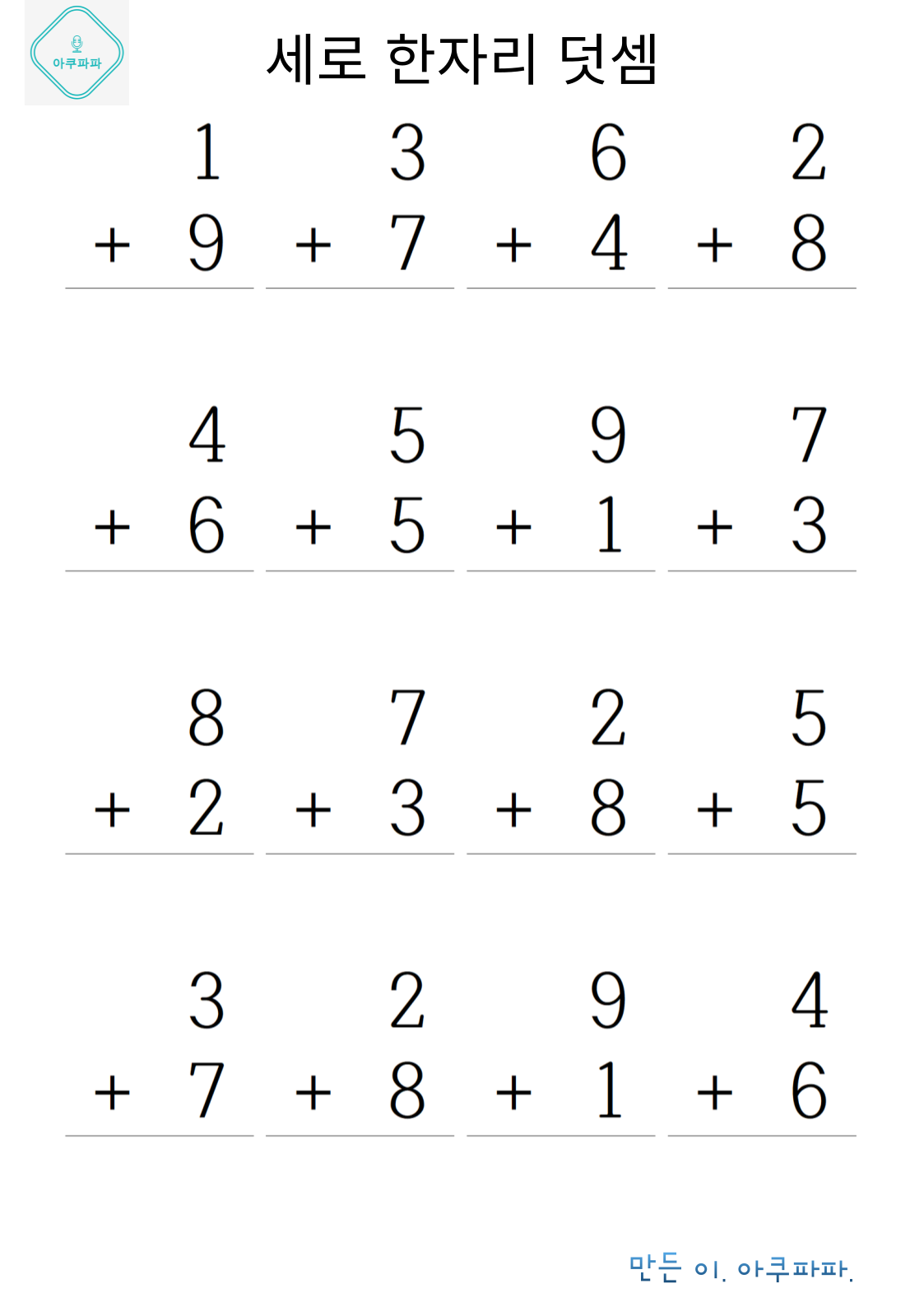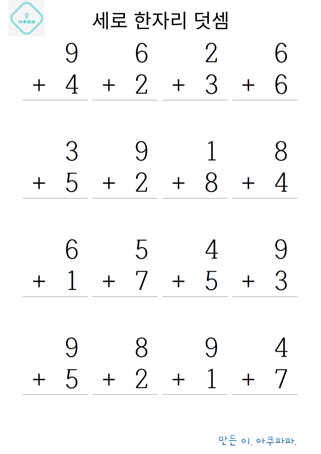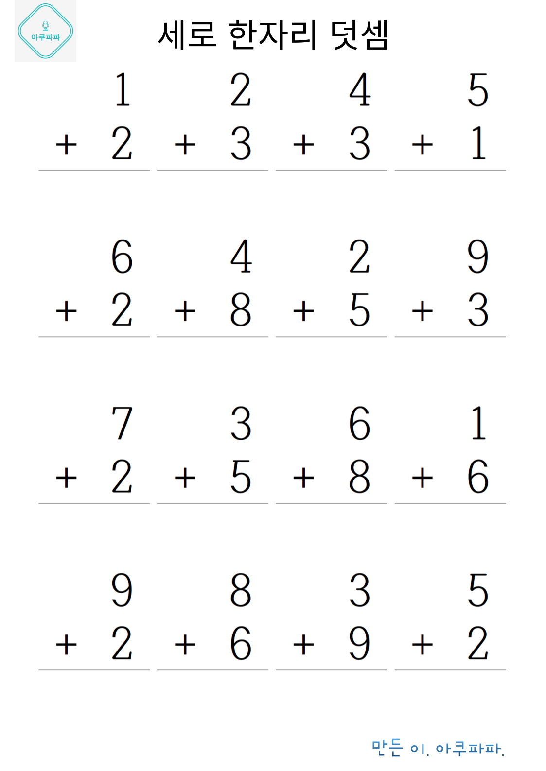 한자릿 수 기초 덧셈손으로 계산하며 풀어 볼 수 있을 정도의 난이도로 이제 막 셈을 배운 유치부 난이도 정도로 매우 쉽게 만들었습니다. 숫자만보고 풀기가 아직 어렵다면 손으로 셈을 하