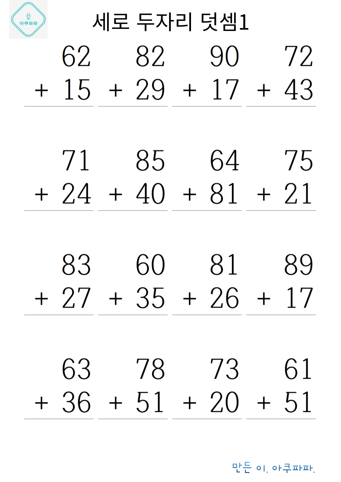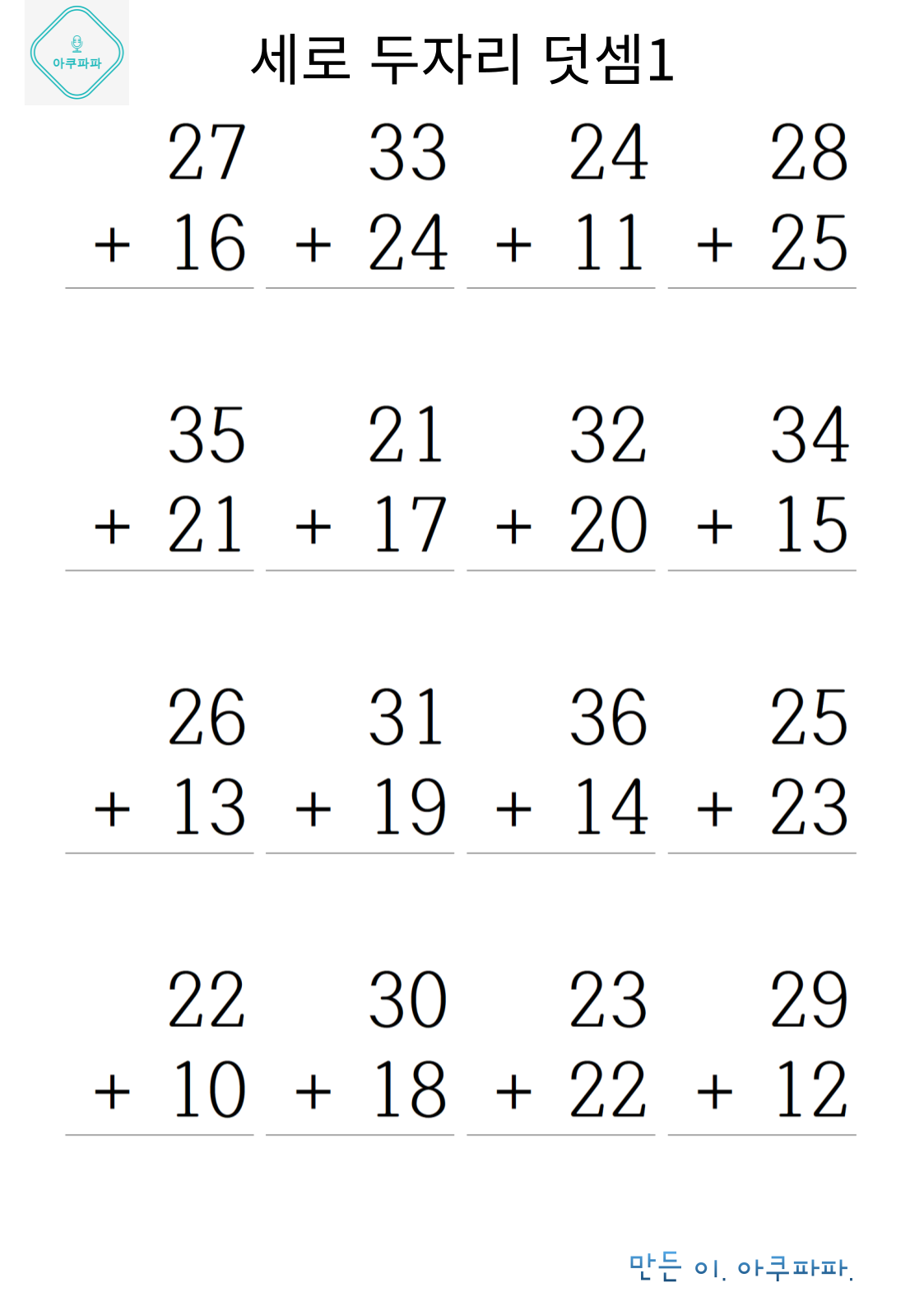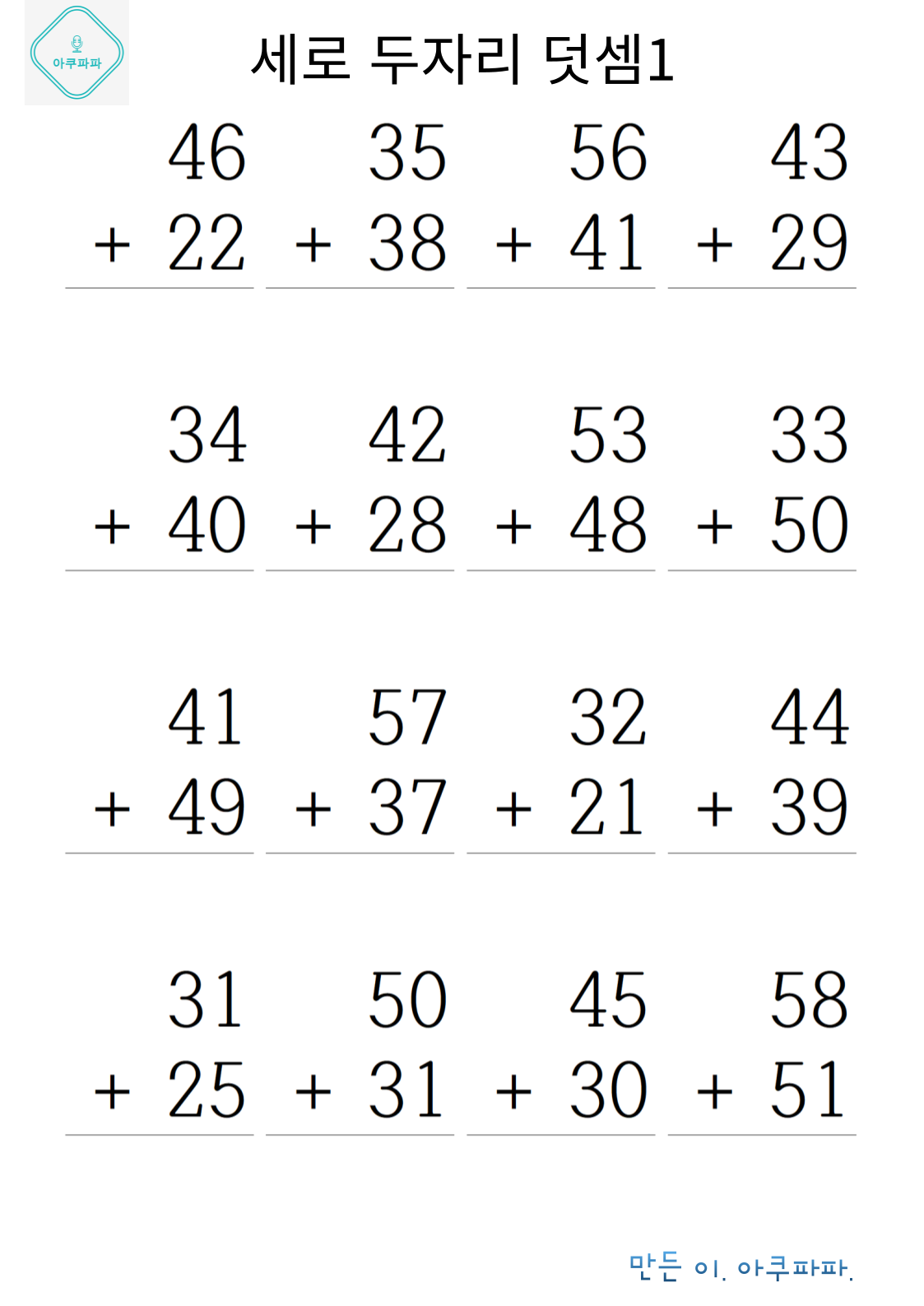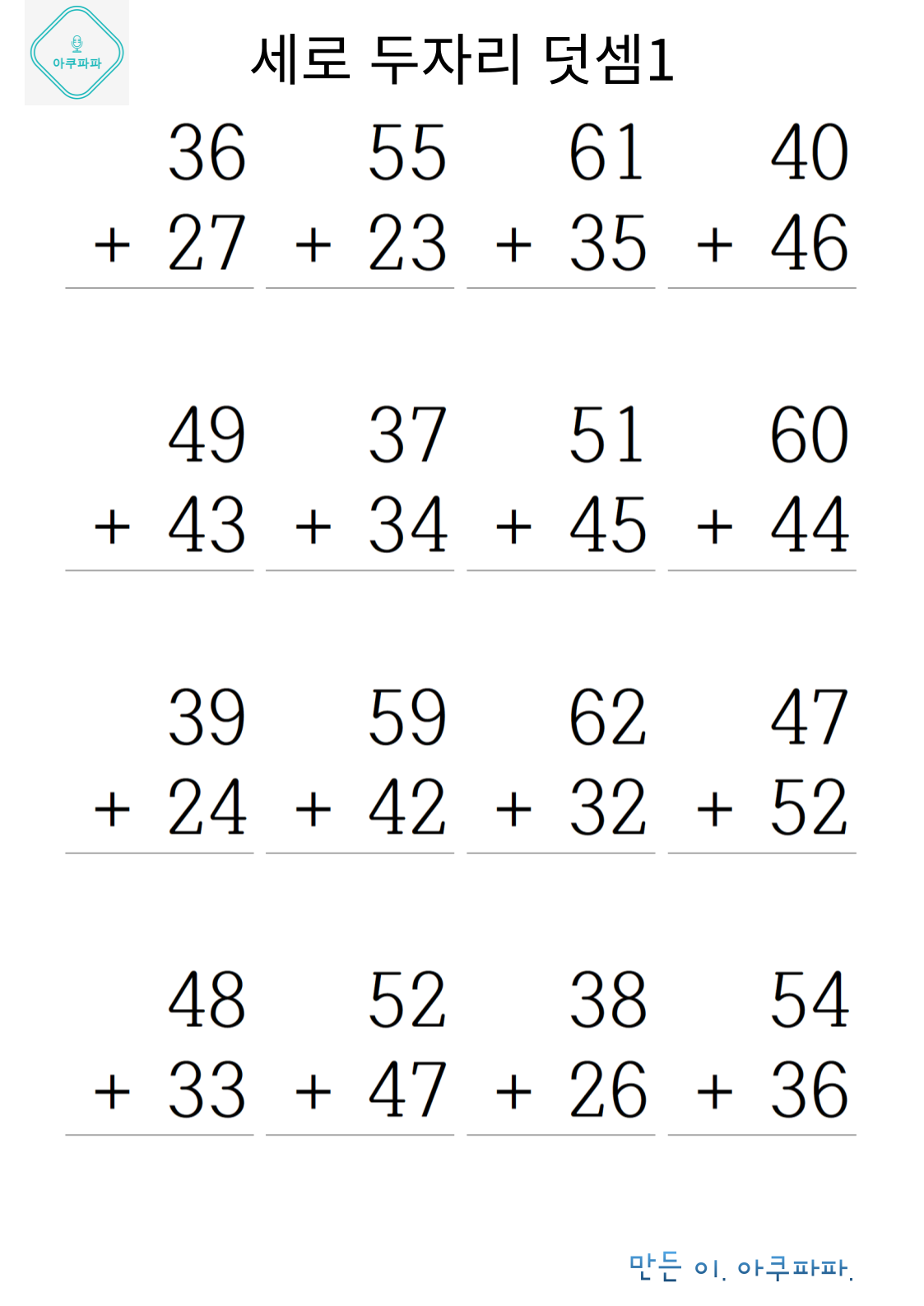 기본적인 두자릿 수 덧셈을 가로로 풀어보고, 이번엔 세로로 풀어 봅니다.