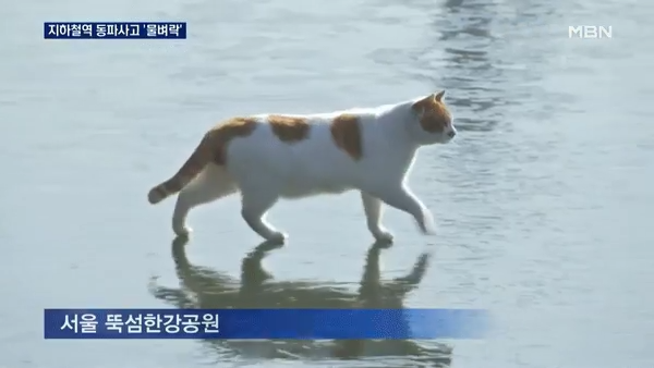 꽁꽁 얼어붙은 한강 위로 고양이가 걸어다닙니다