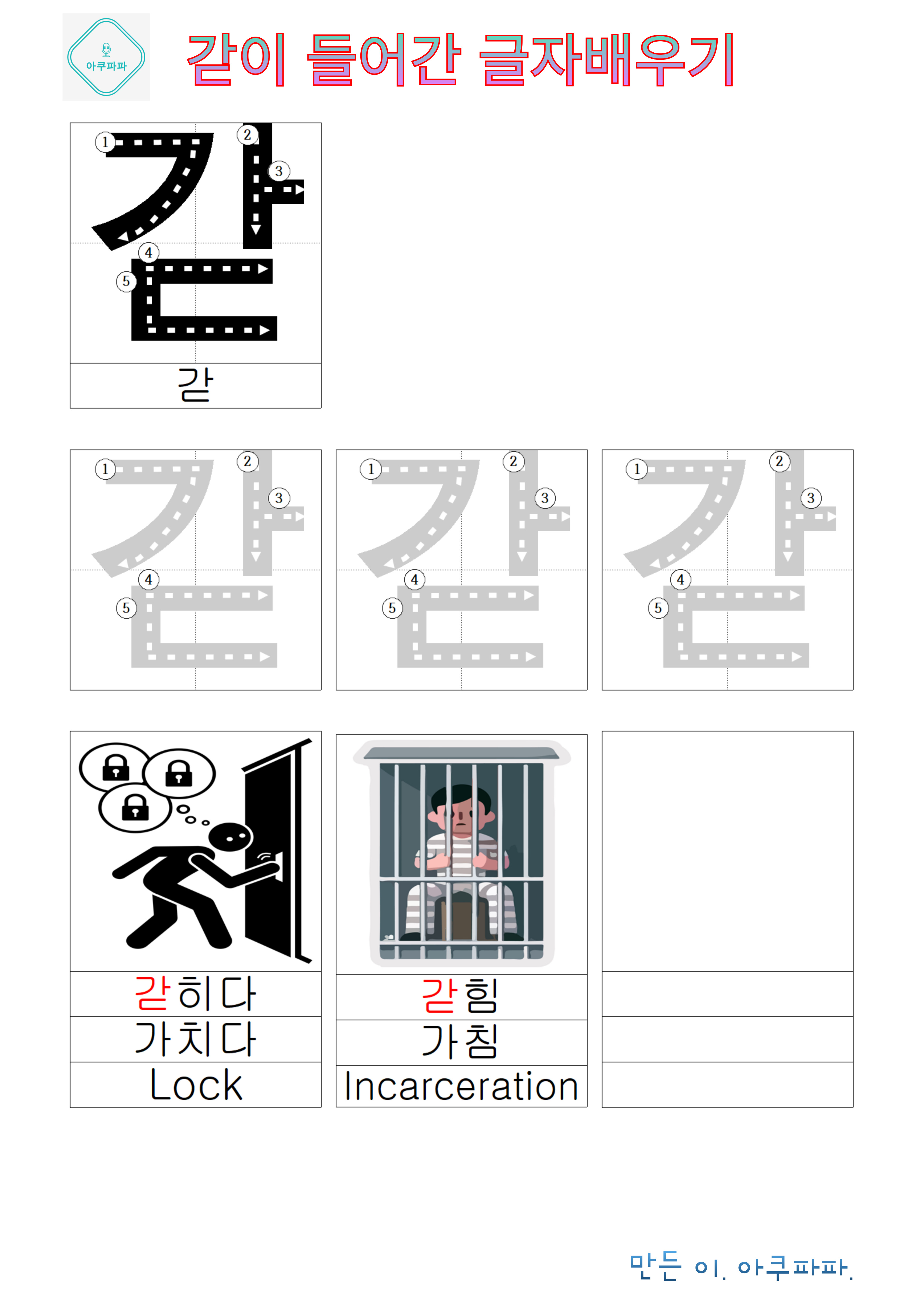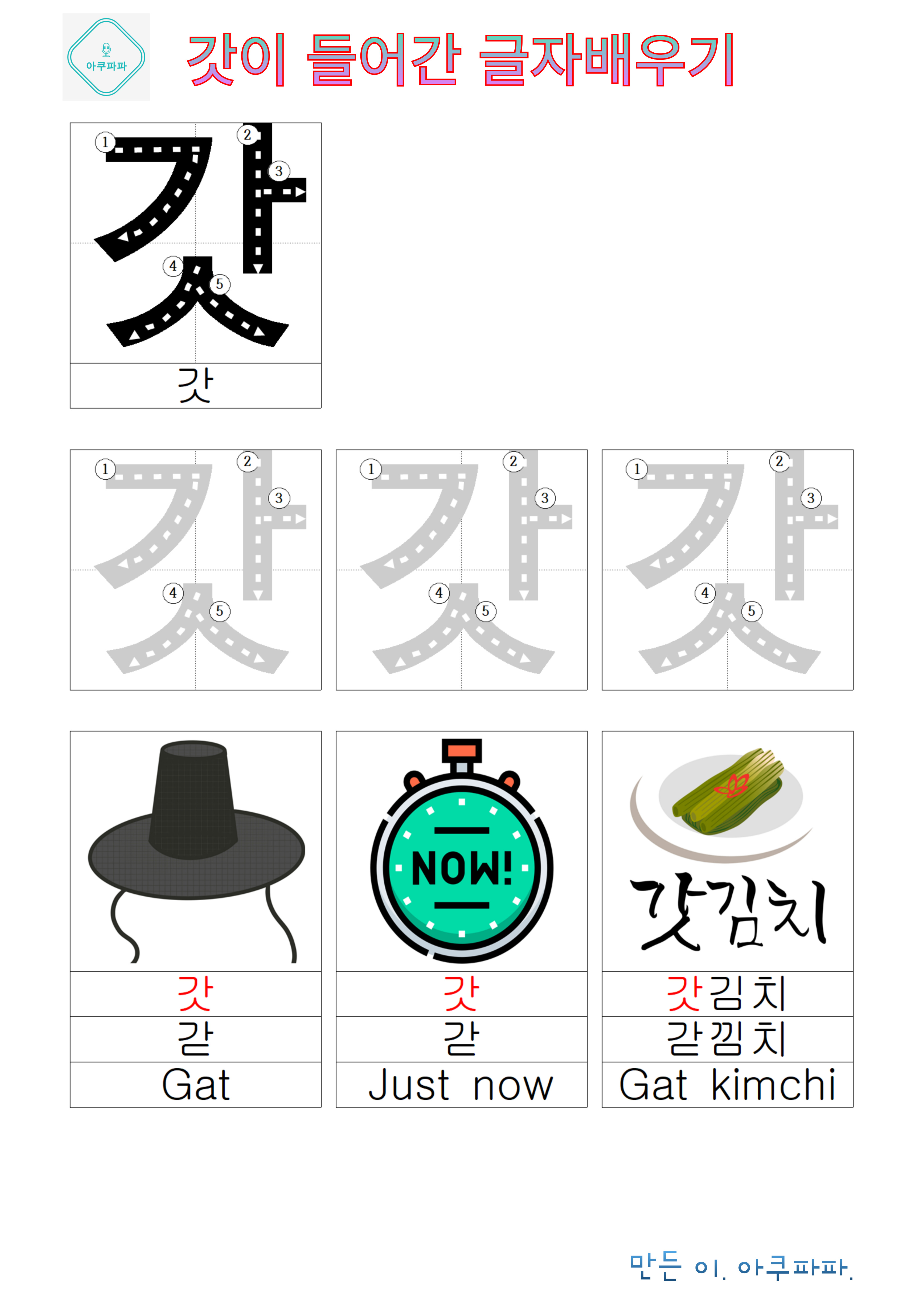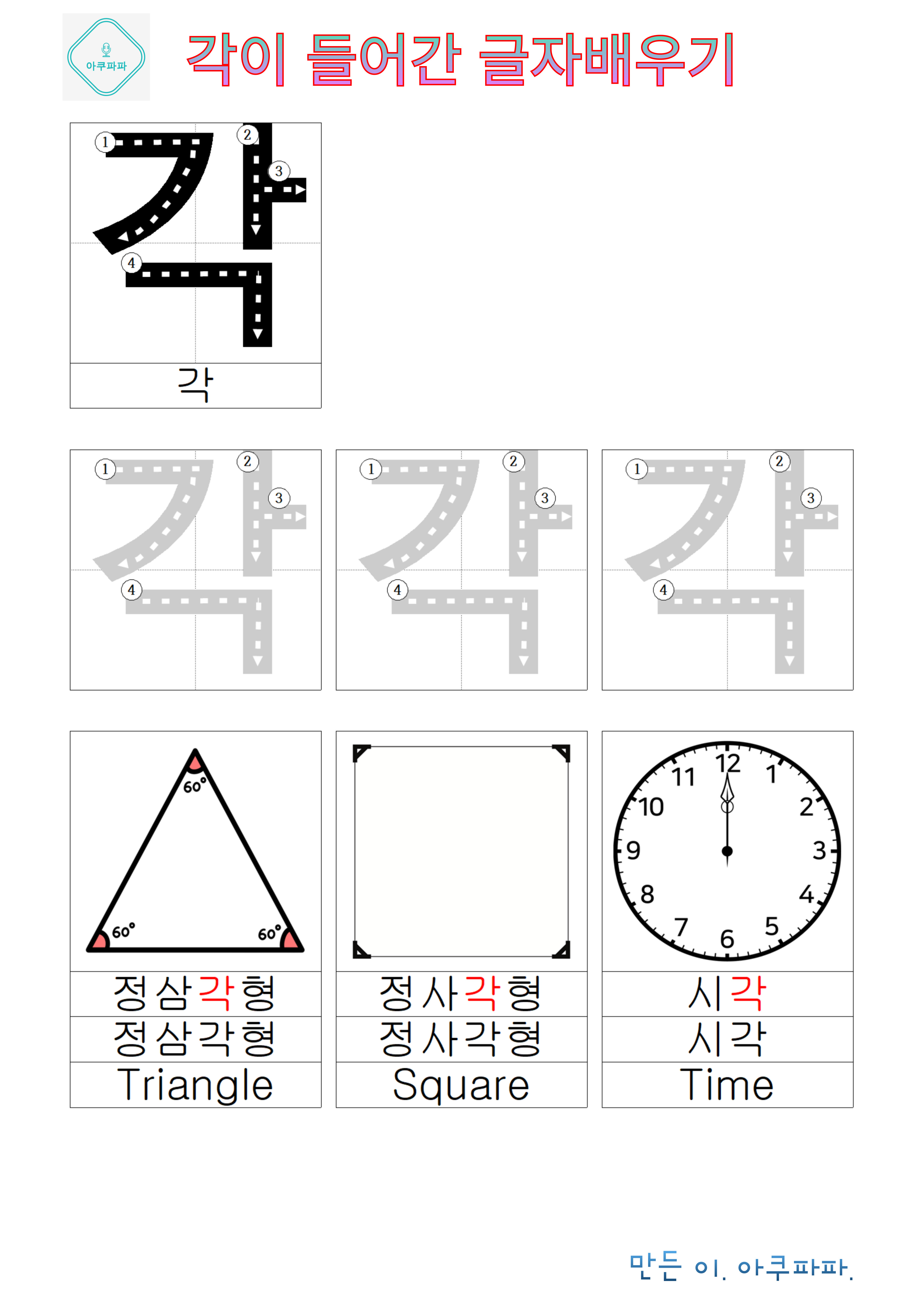 이제는 각 부터 시작해서 받침이 들어간 글자를 배워볼 차례 입니다.