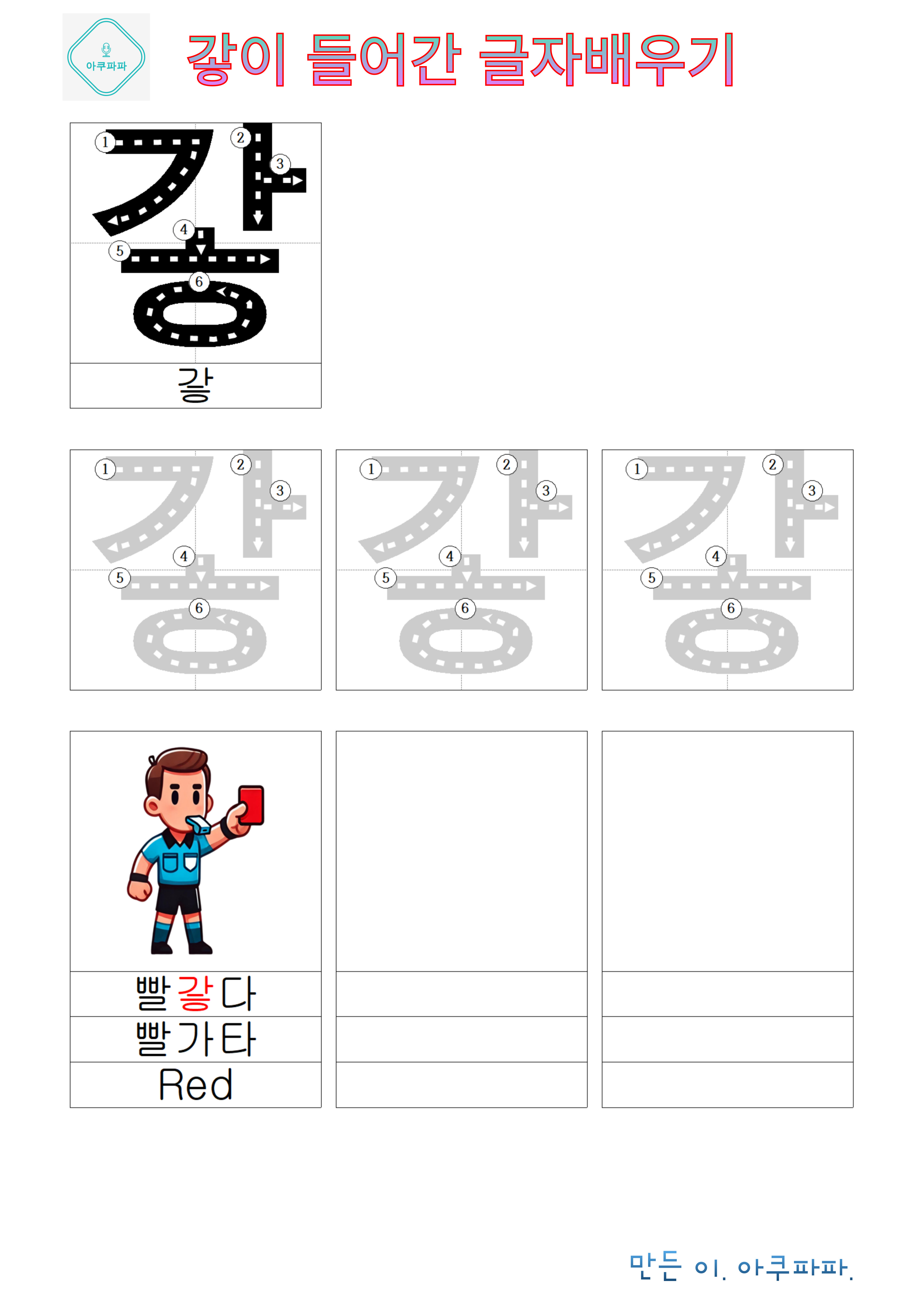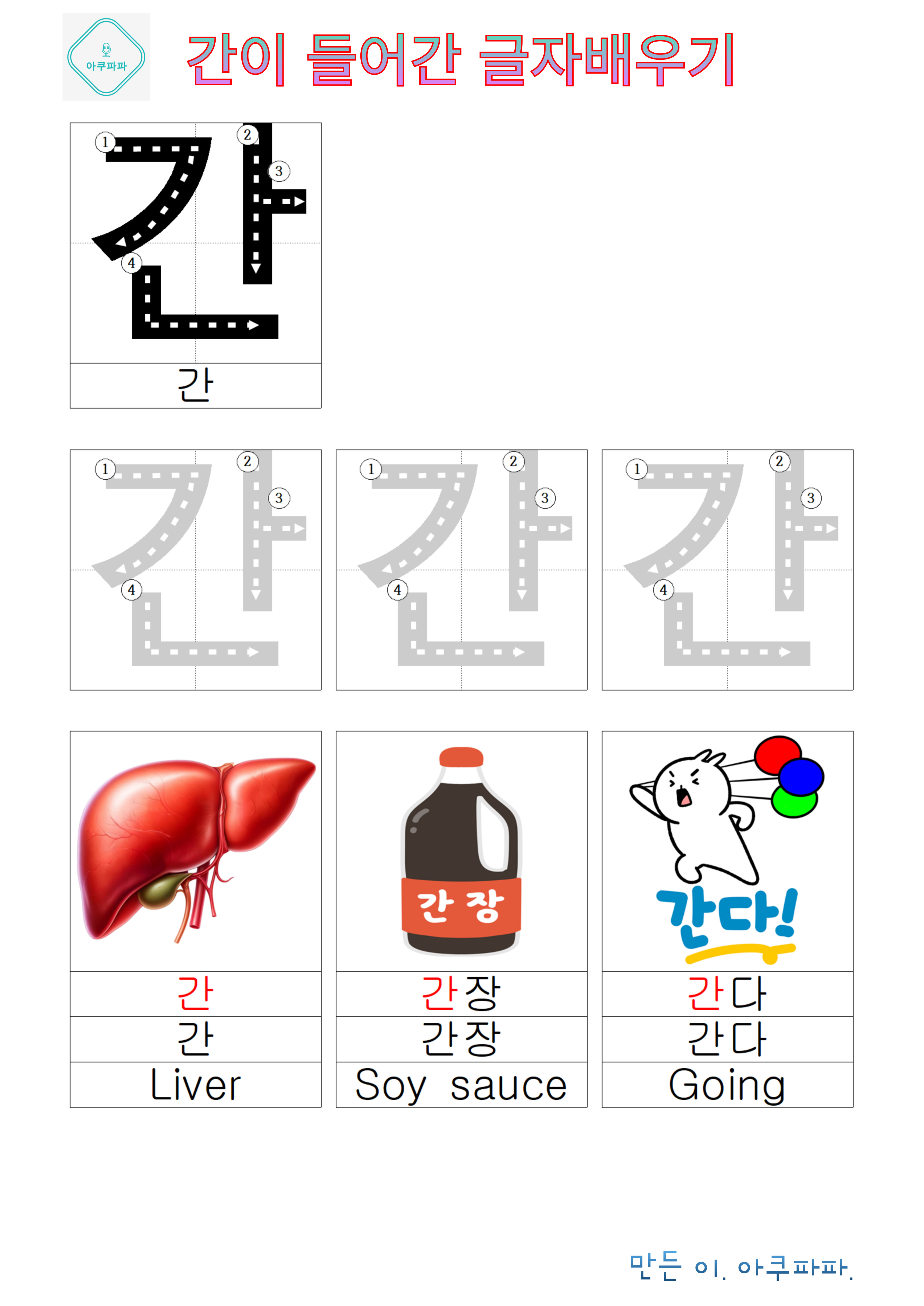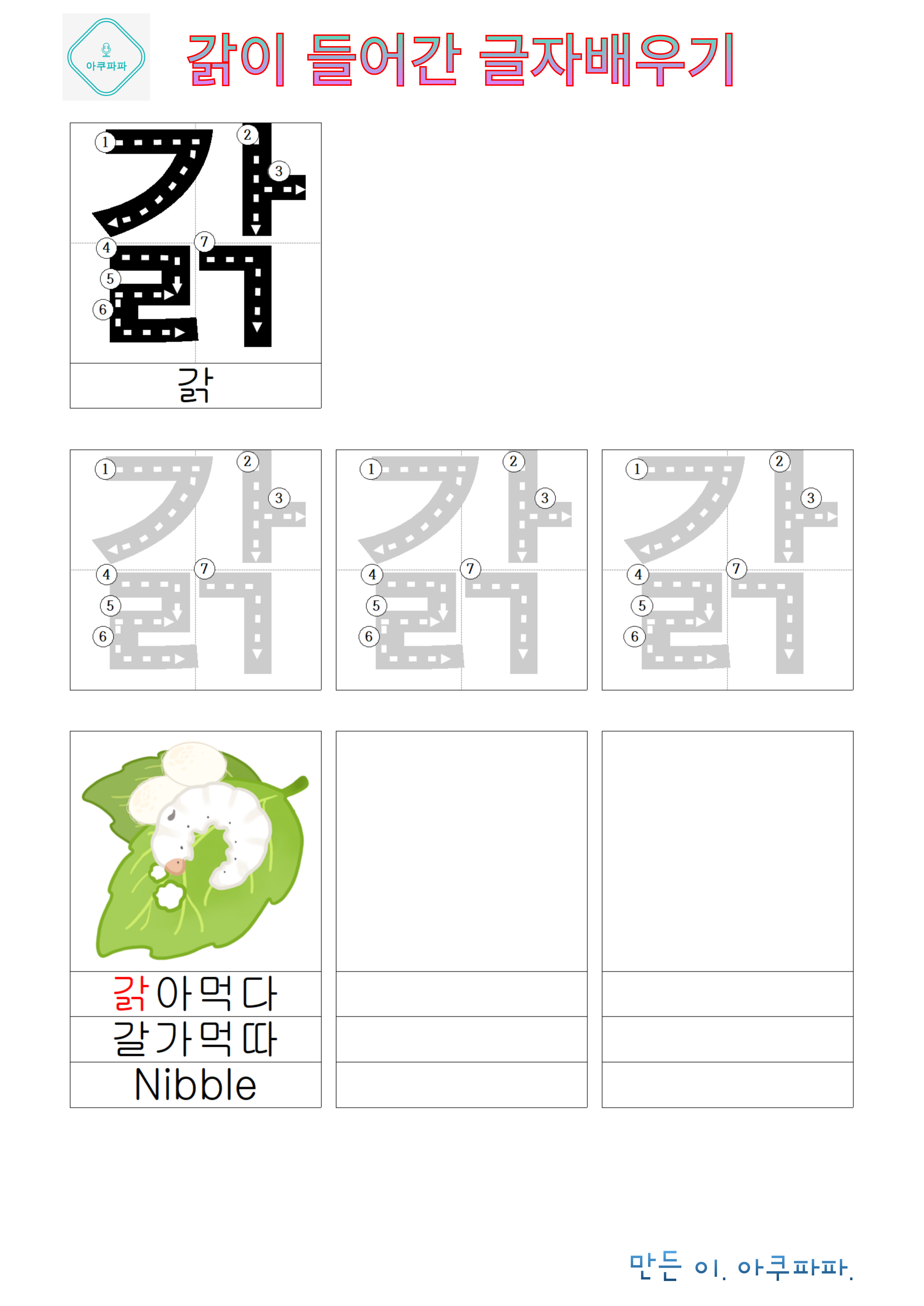 이제는 각 부터 시작해서 받침이 들어간 글자를 배워볼 차례 입니다.
