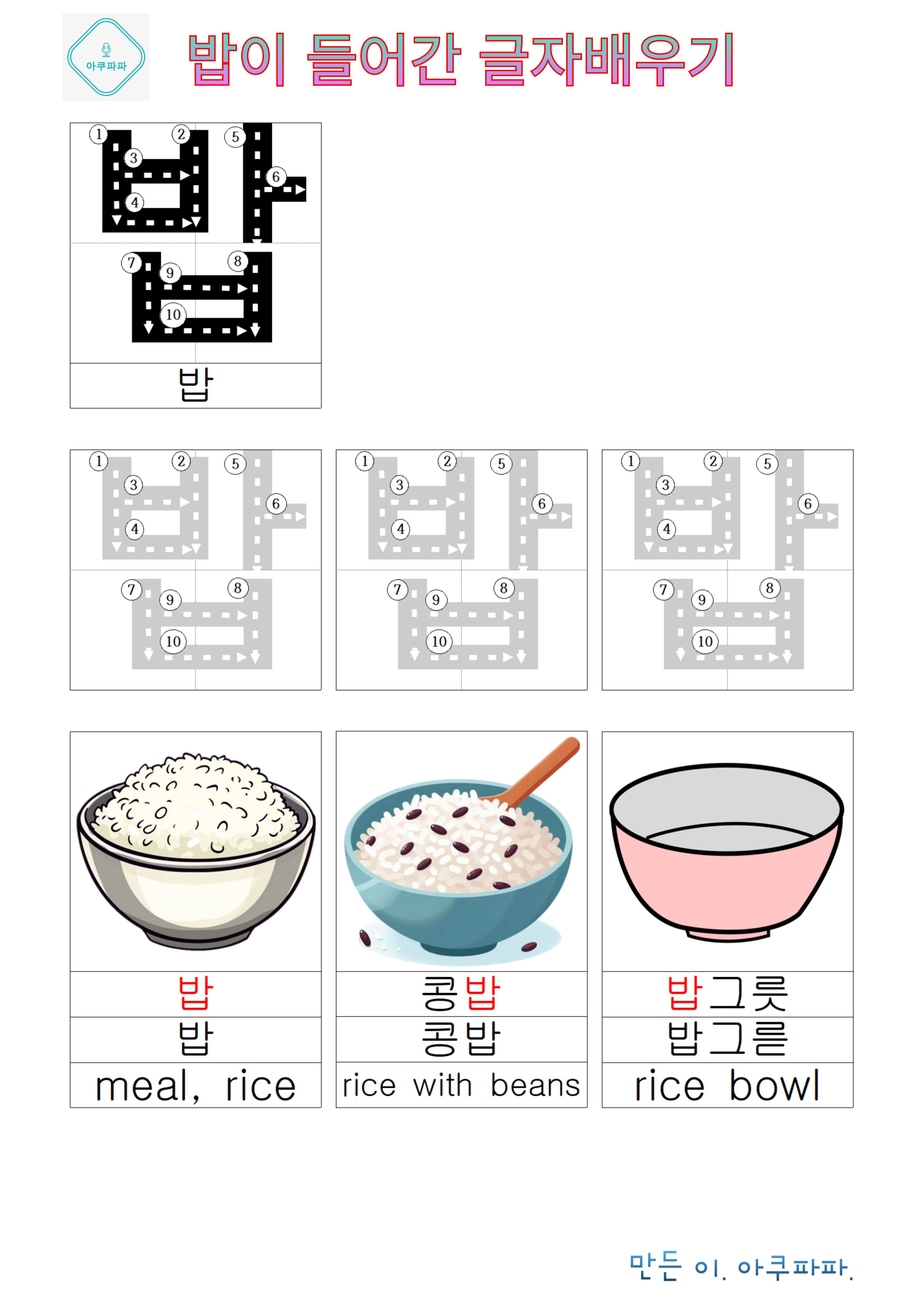 밥, 밤 등 한 글자 만으로 맛있는 글자도 있어요.