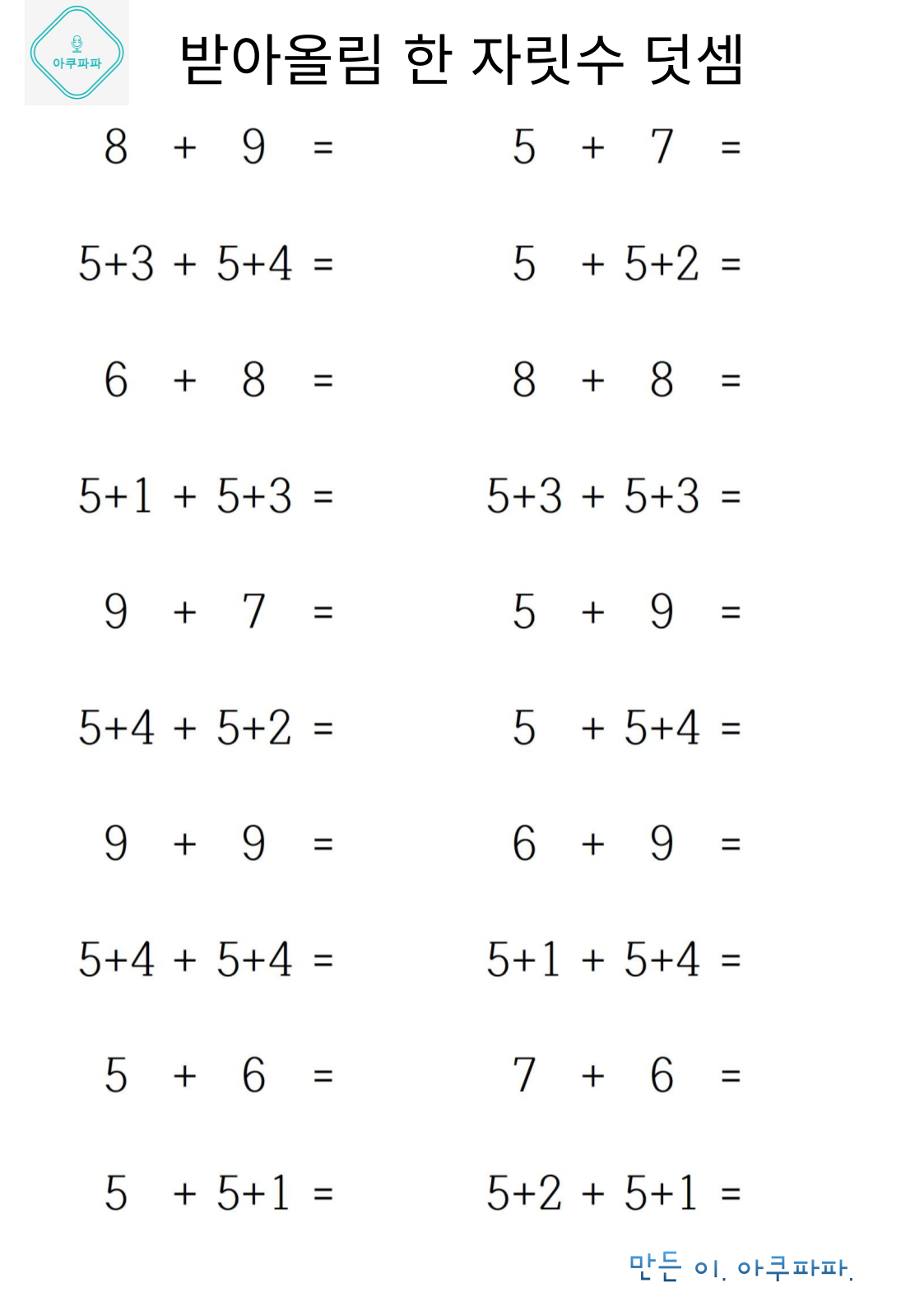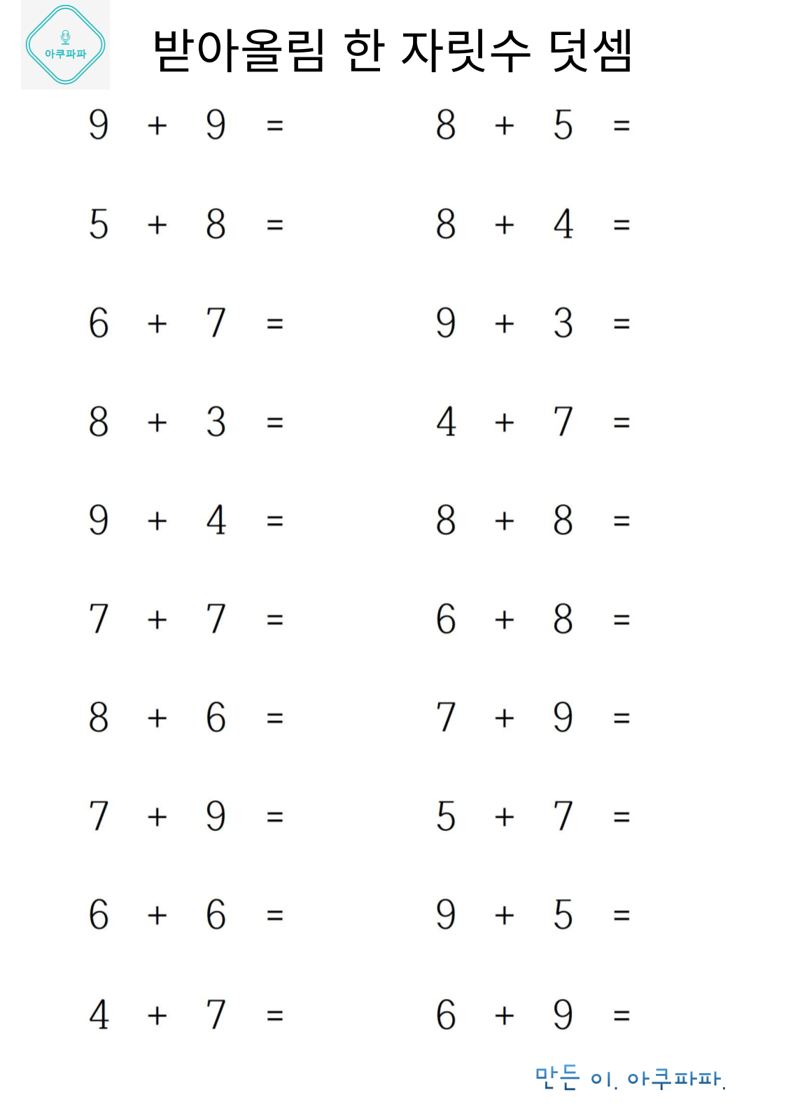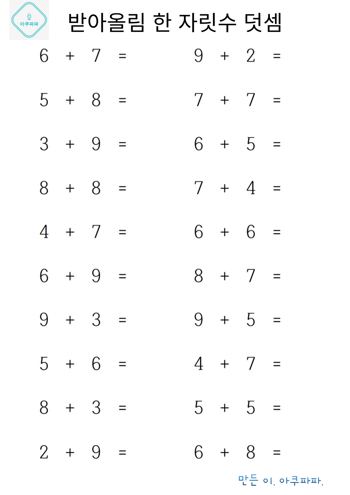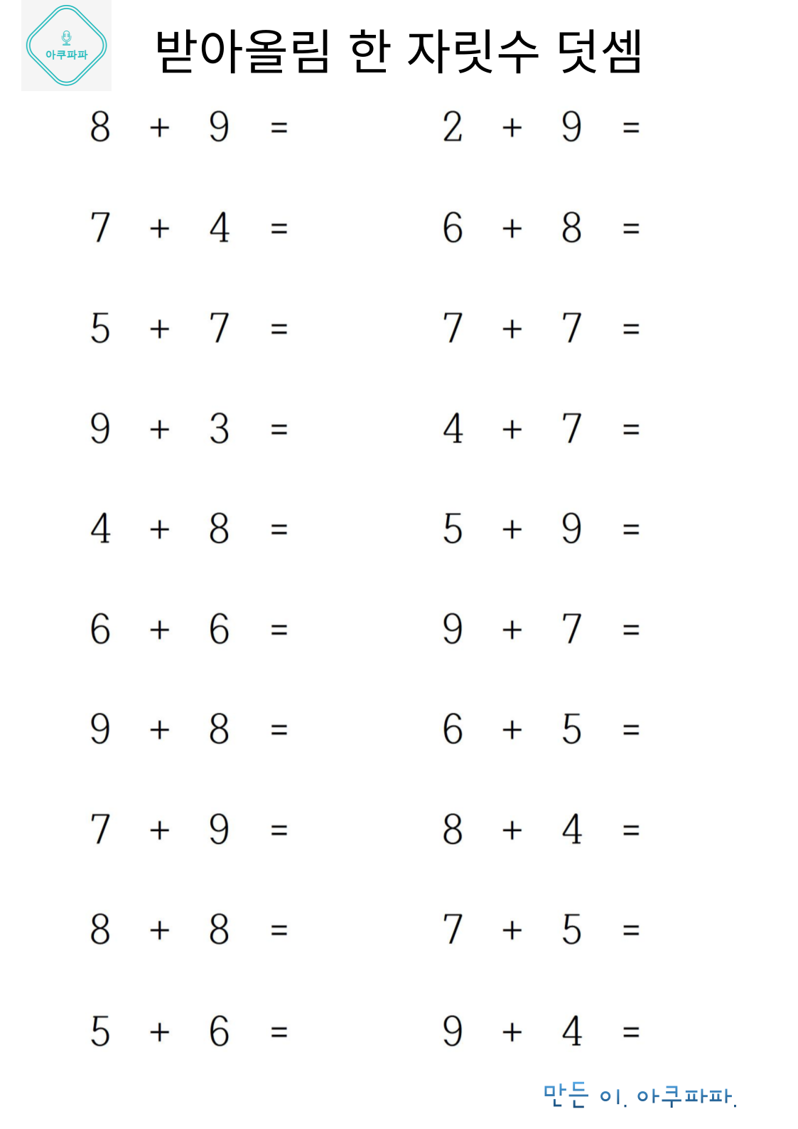 다음의 연습 문제들을 풀어보며 한 자릿수 받아올림을 마무리해 보세요.