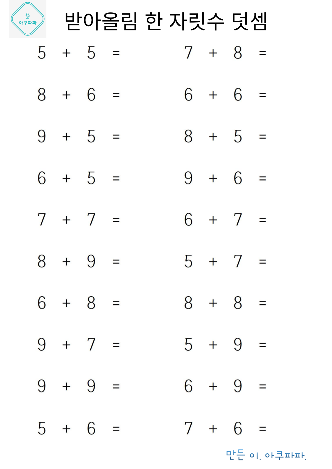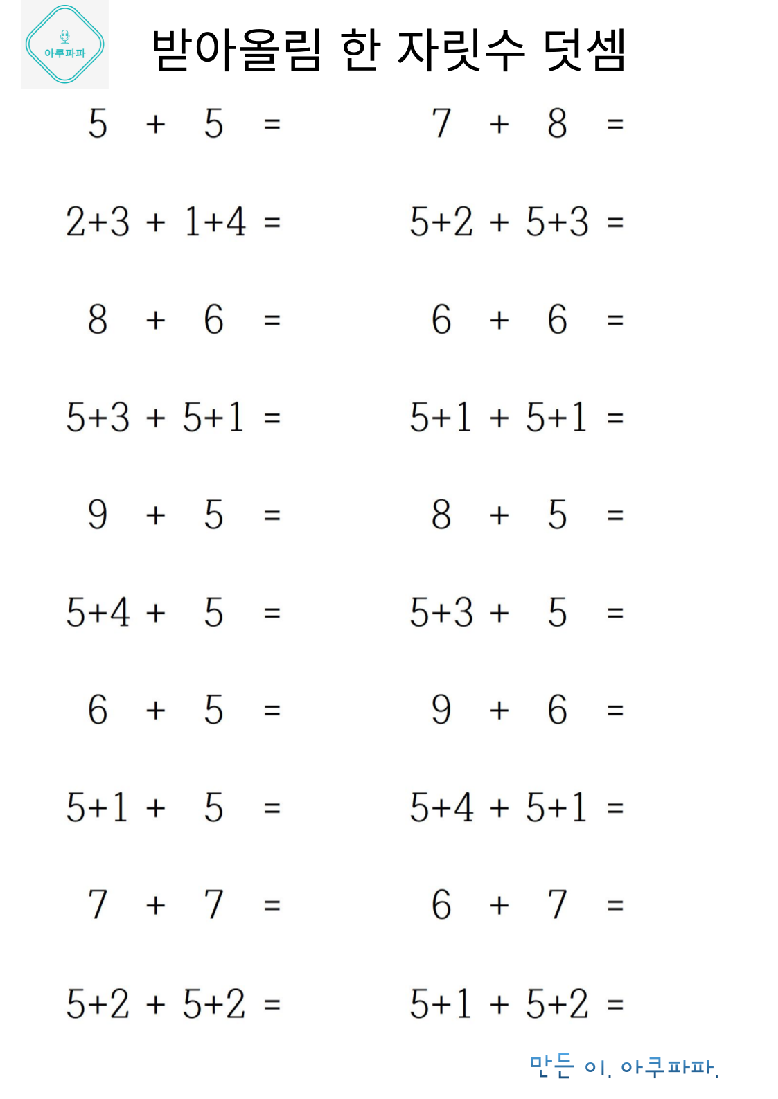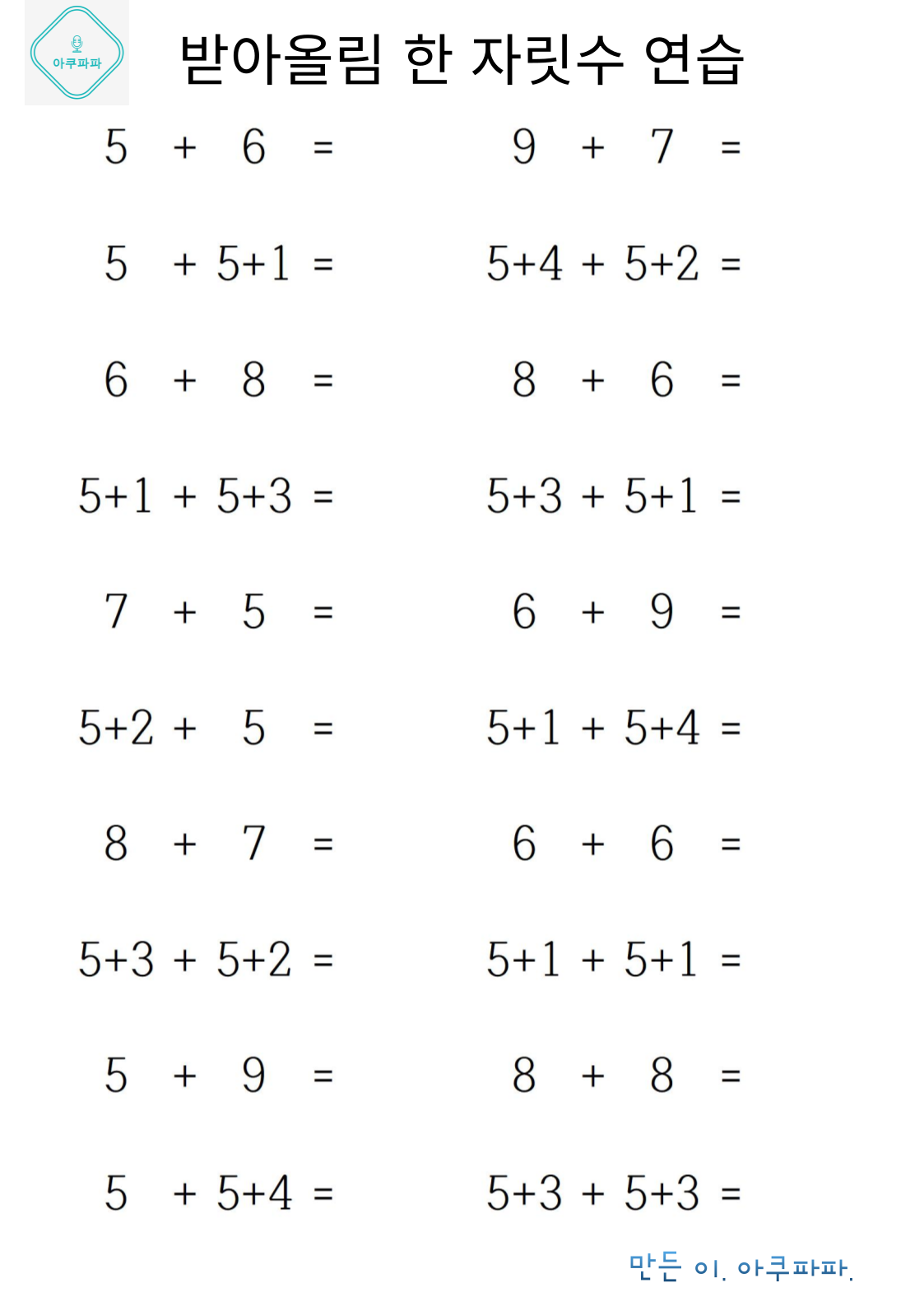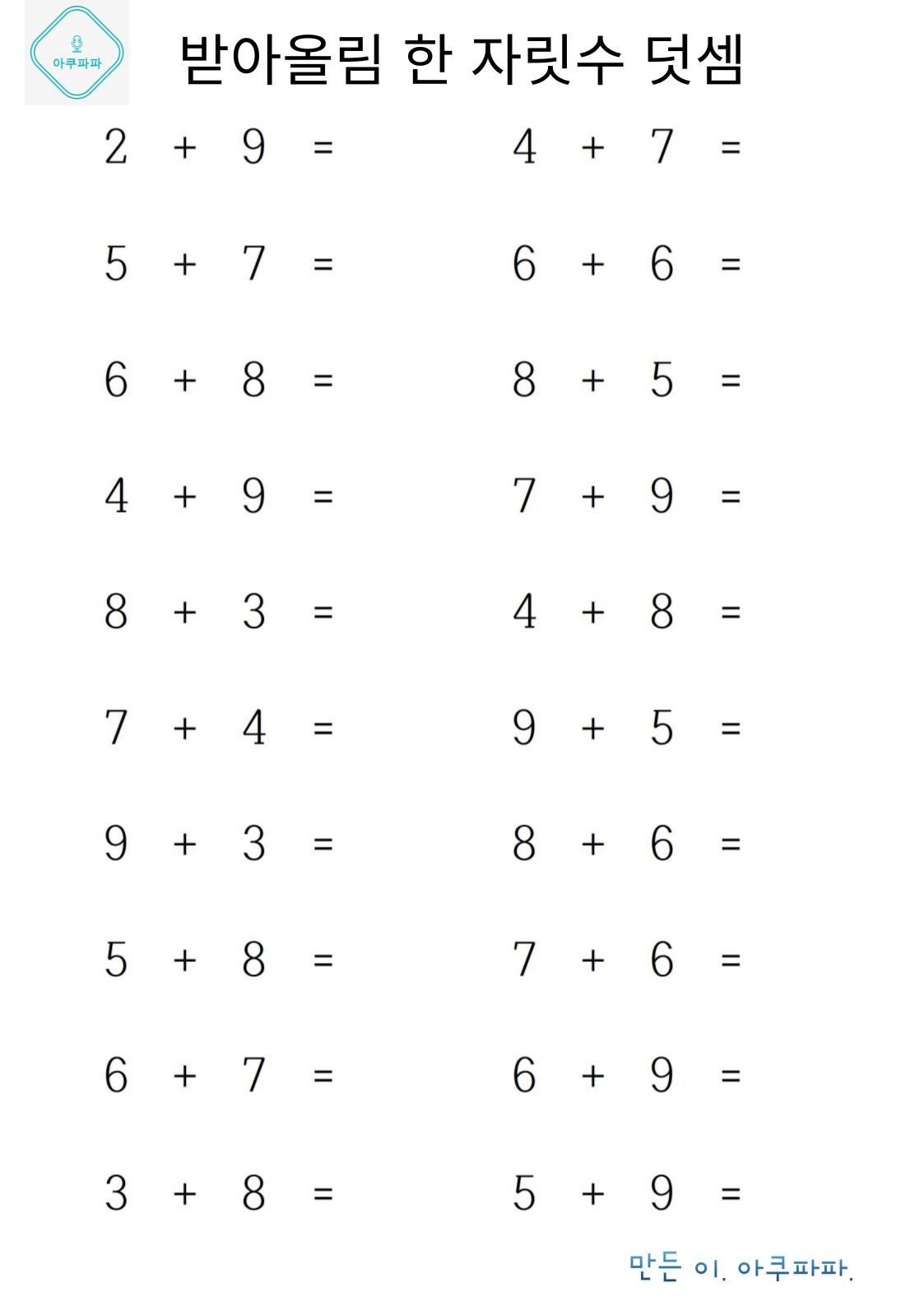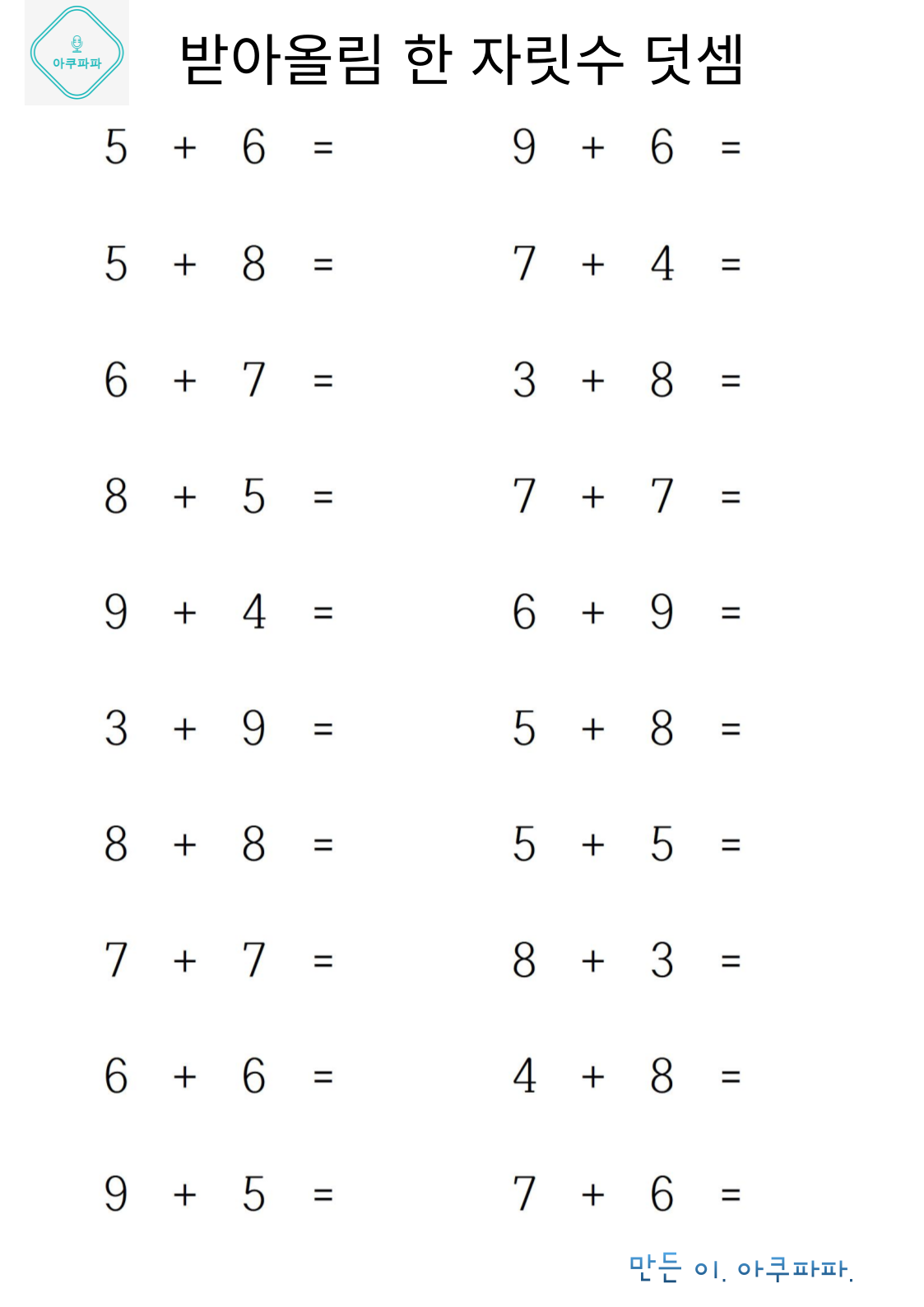 다음의 연습 문제들을 풀어보며 한 자릿수 받아올림을 마무리해 보세요.