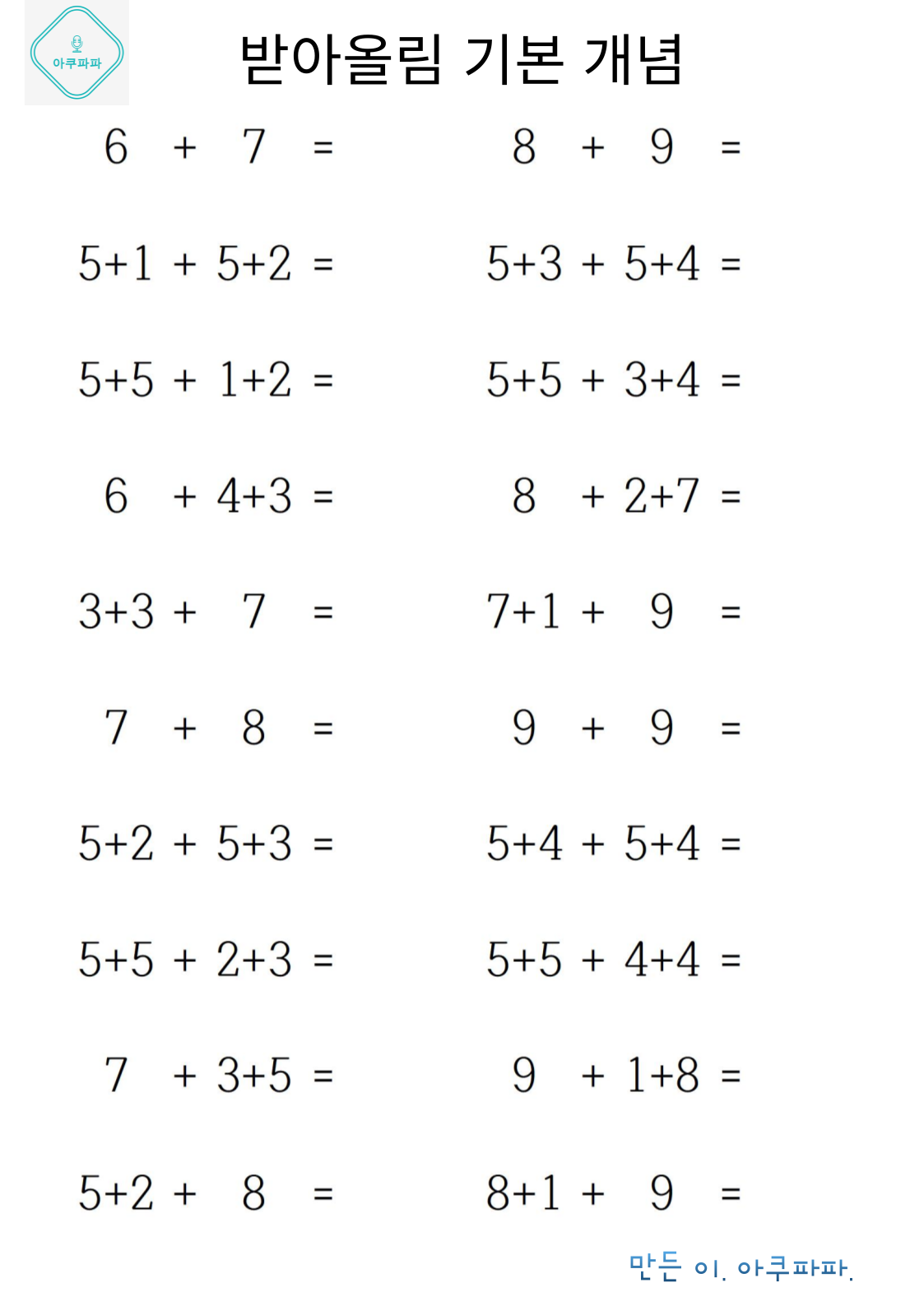 받아 올린다는 개념을 이해하고, 쉬운 숫자로 반복 훈련하여 기본 개념을 익힐 수 있습니다.