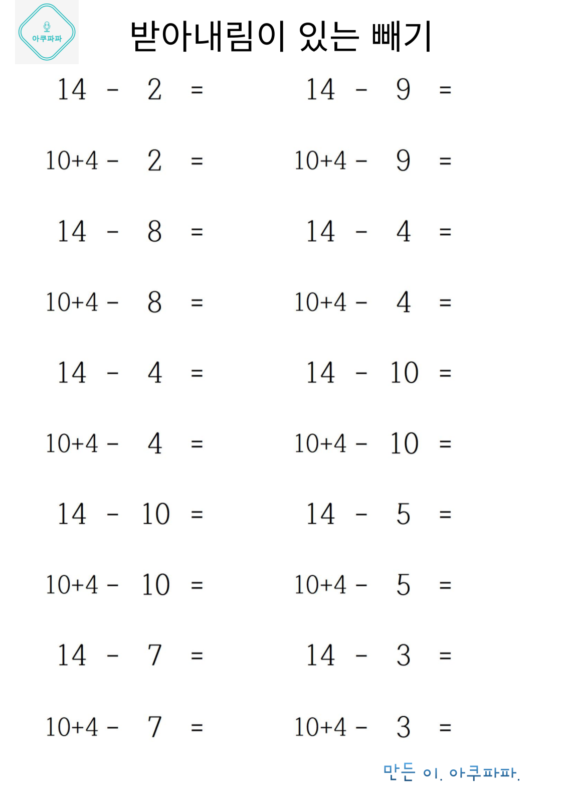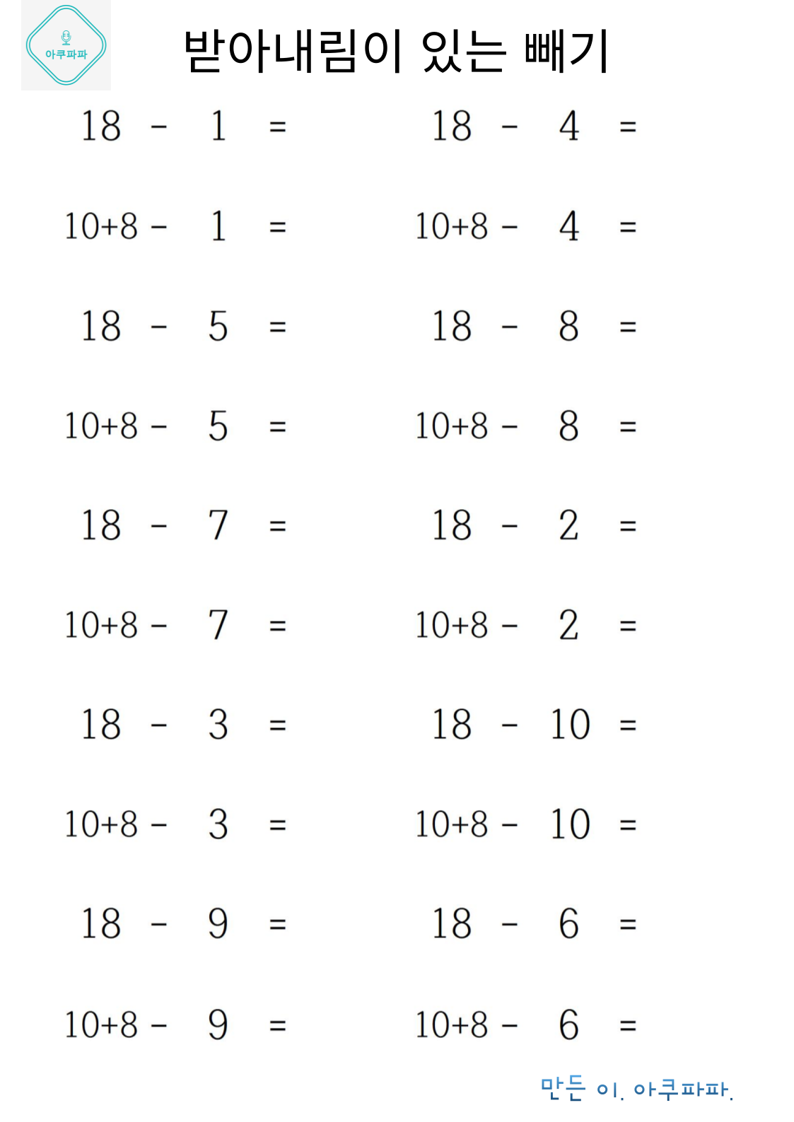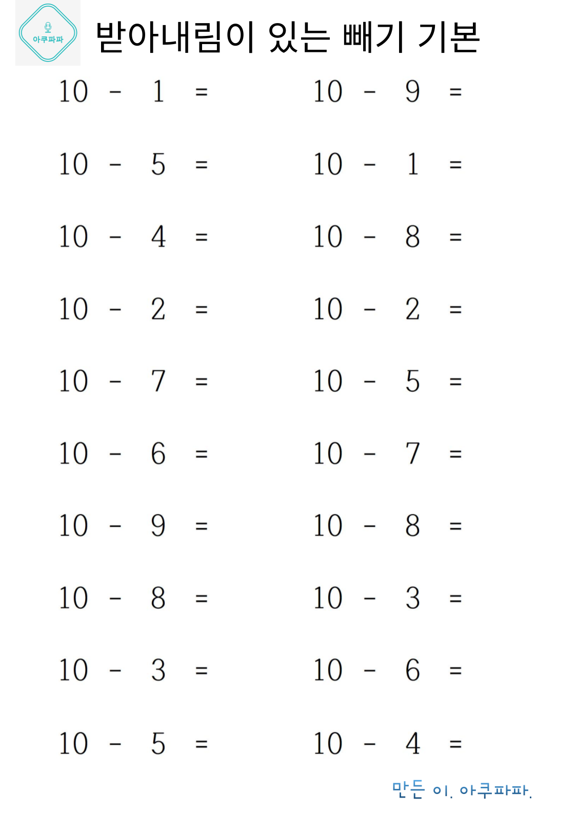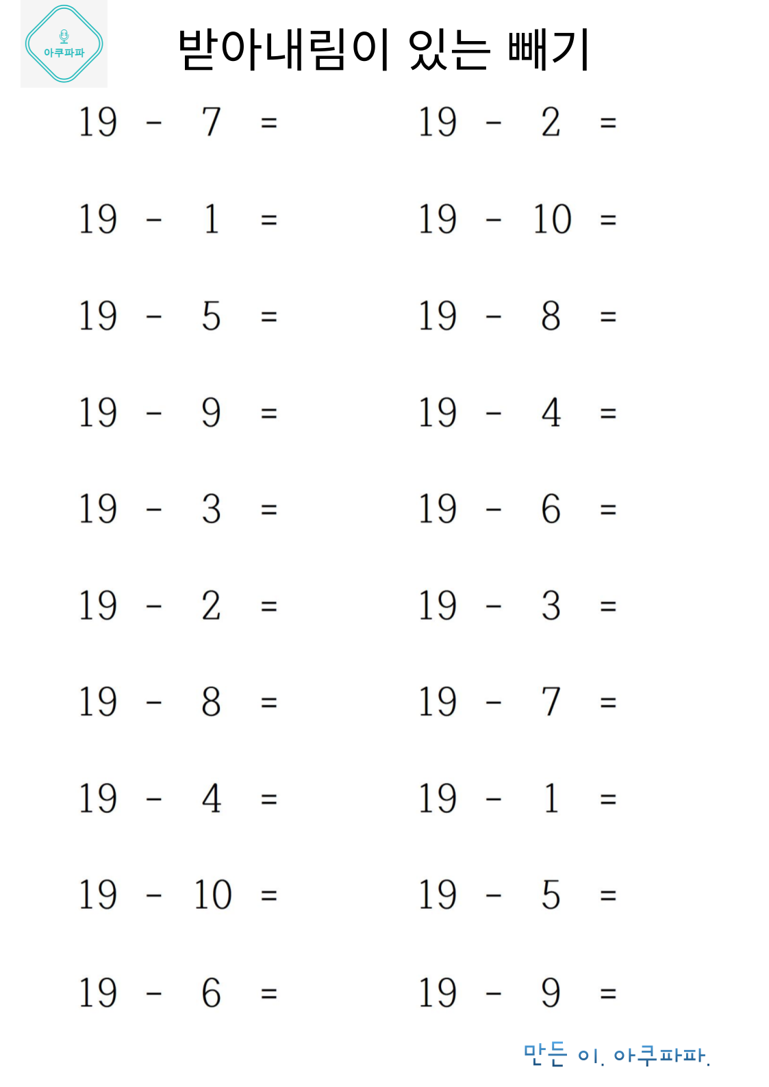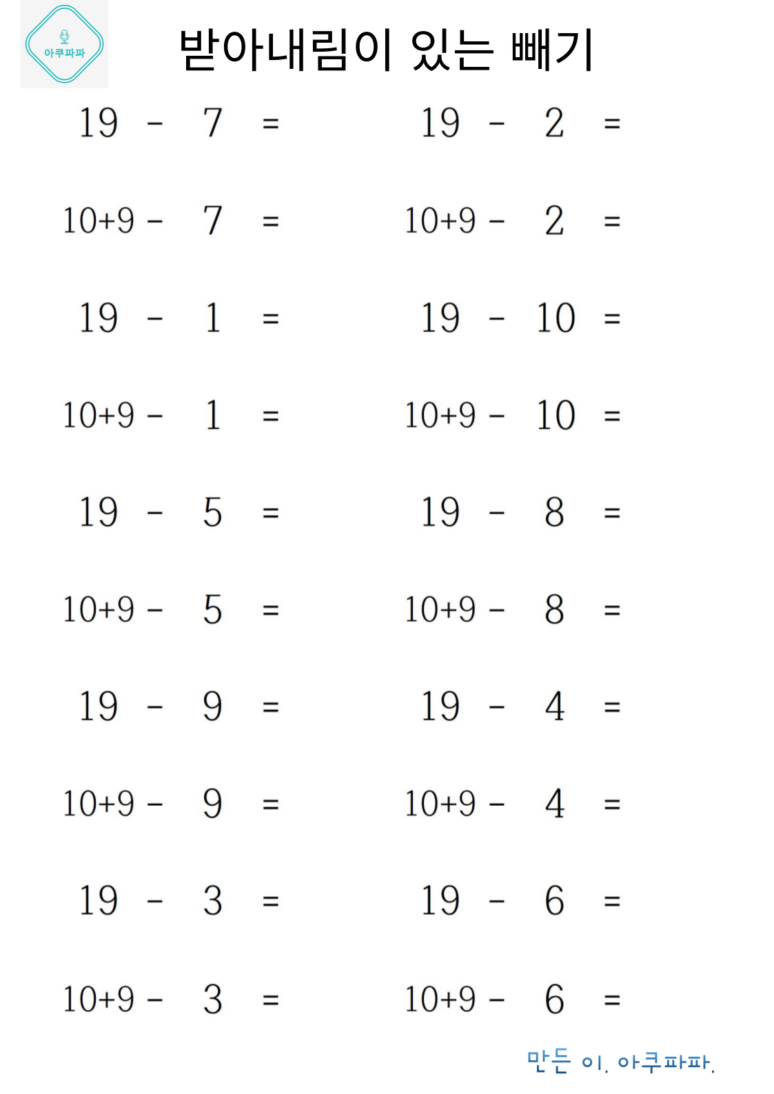 10 - 1 부터 19 - 9 까지 십몇(1n) - 몇(m) 의 계산을 기본으로 만들었습니다.