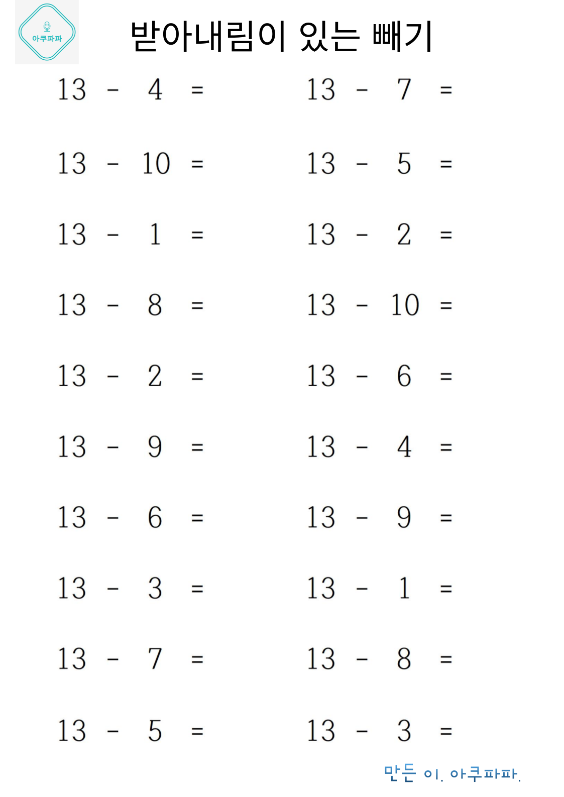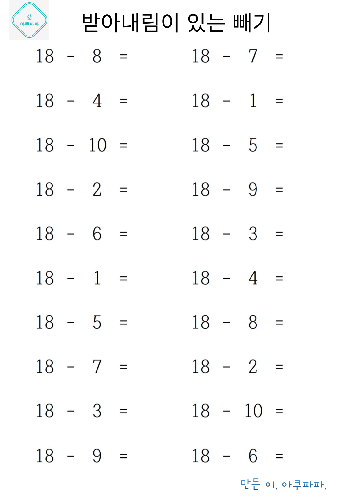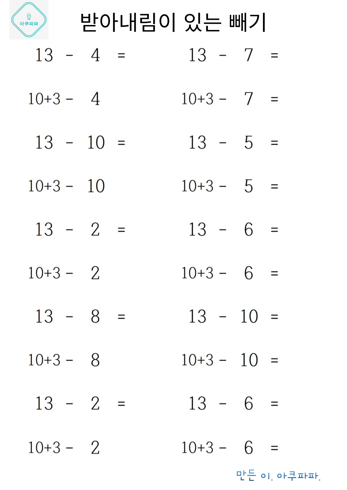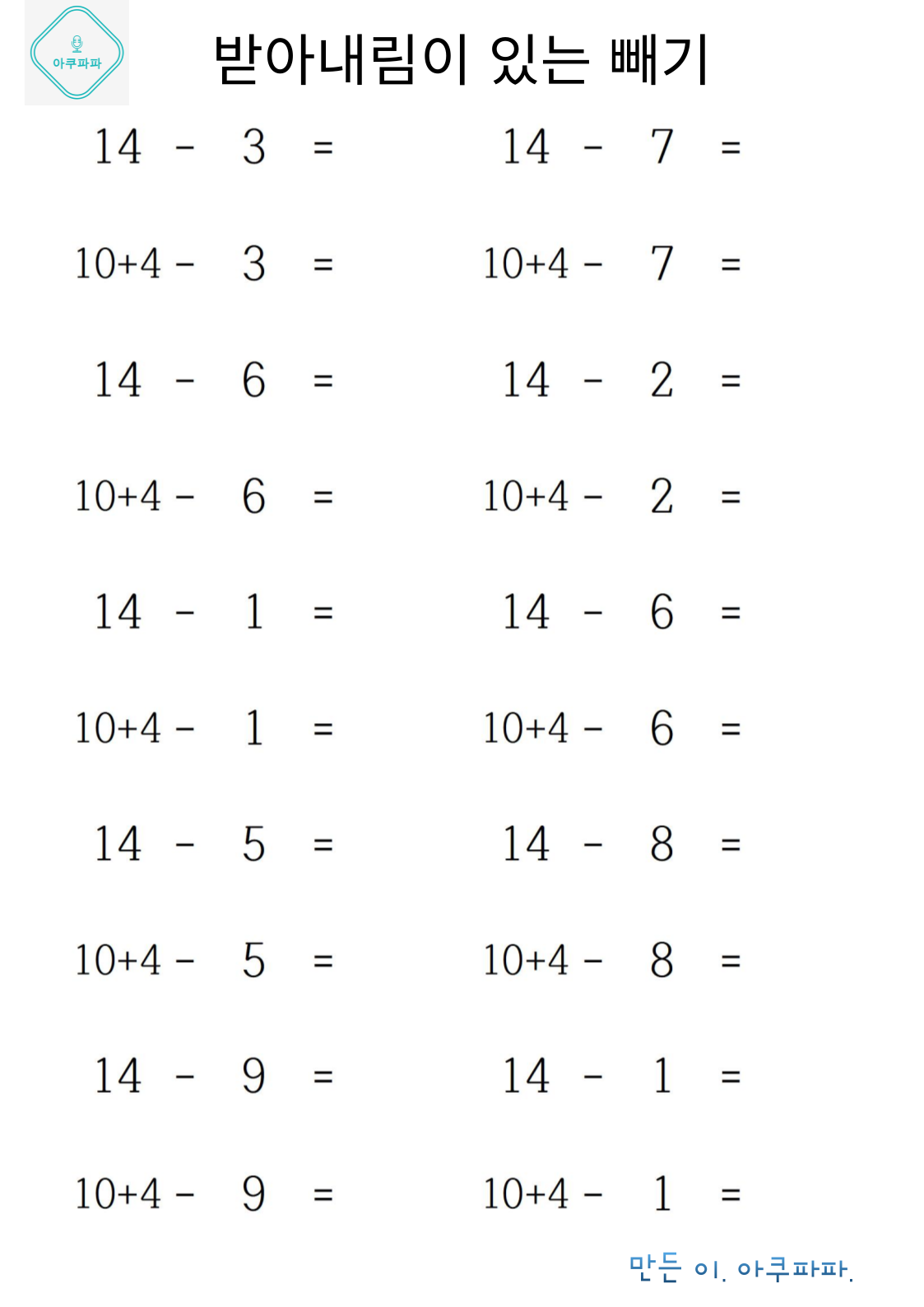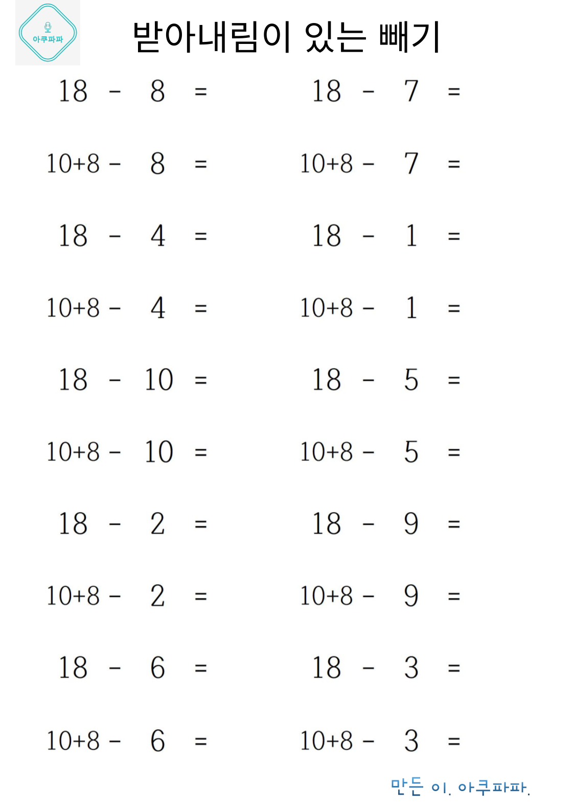 10 - 1 부터 19 - 9 까지 십몇(1n) - 몇(m) 의 계산을 기본으로 만들었습니다.