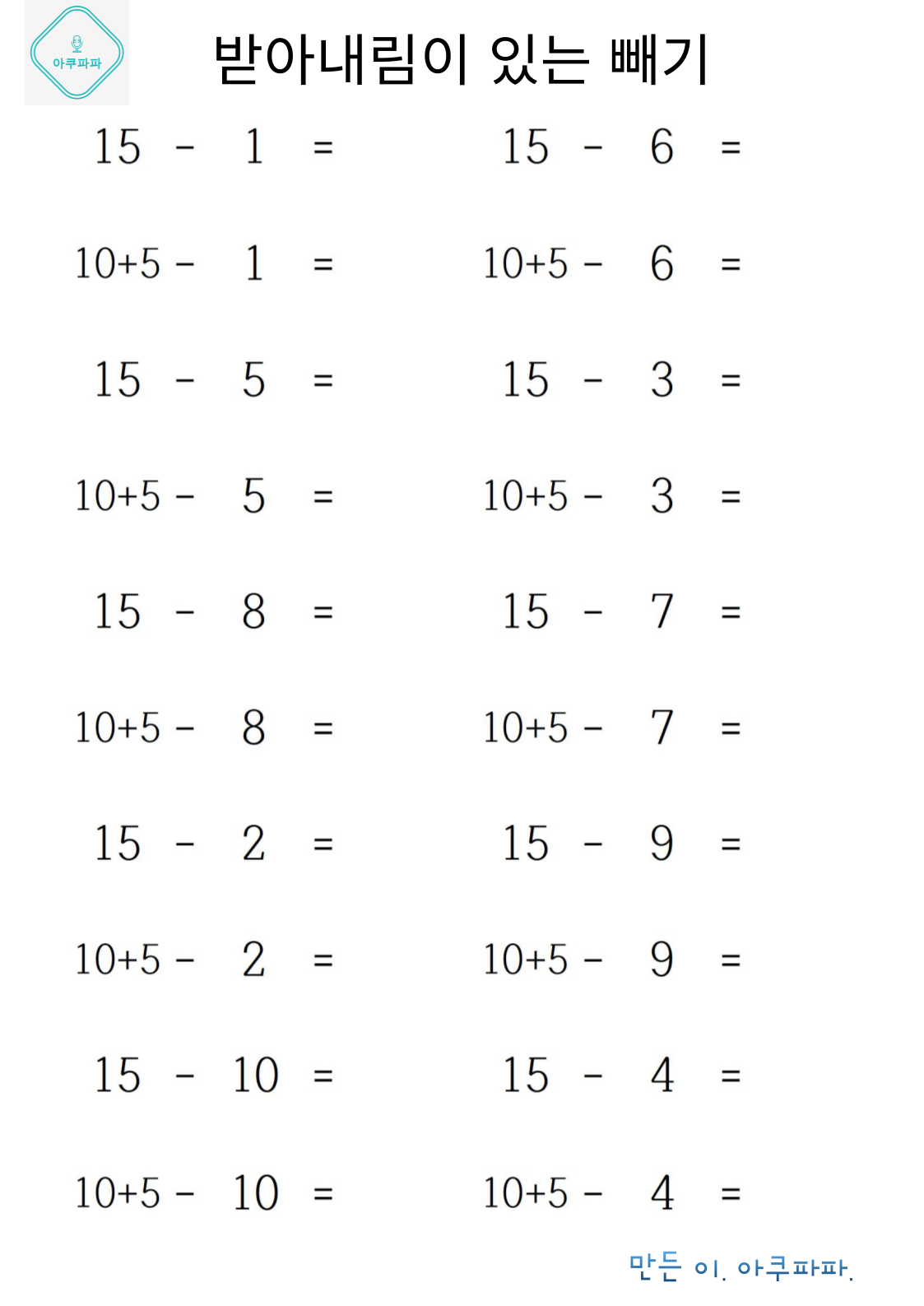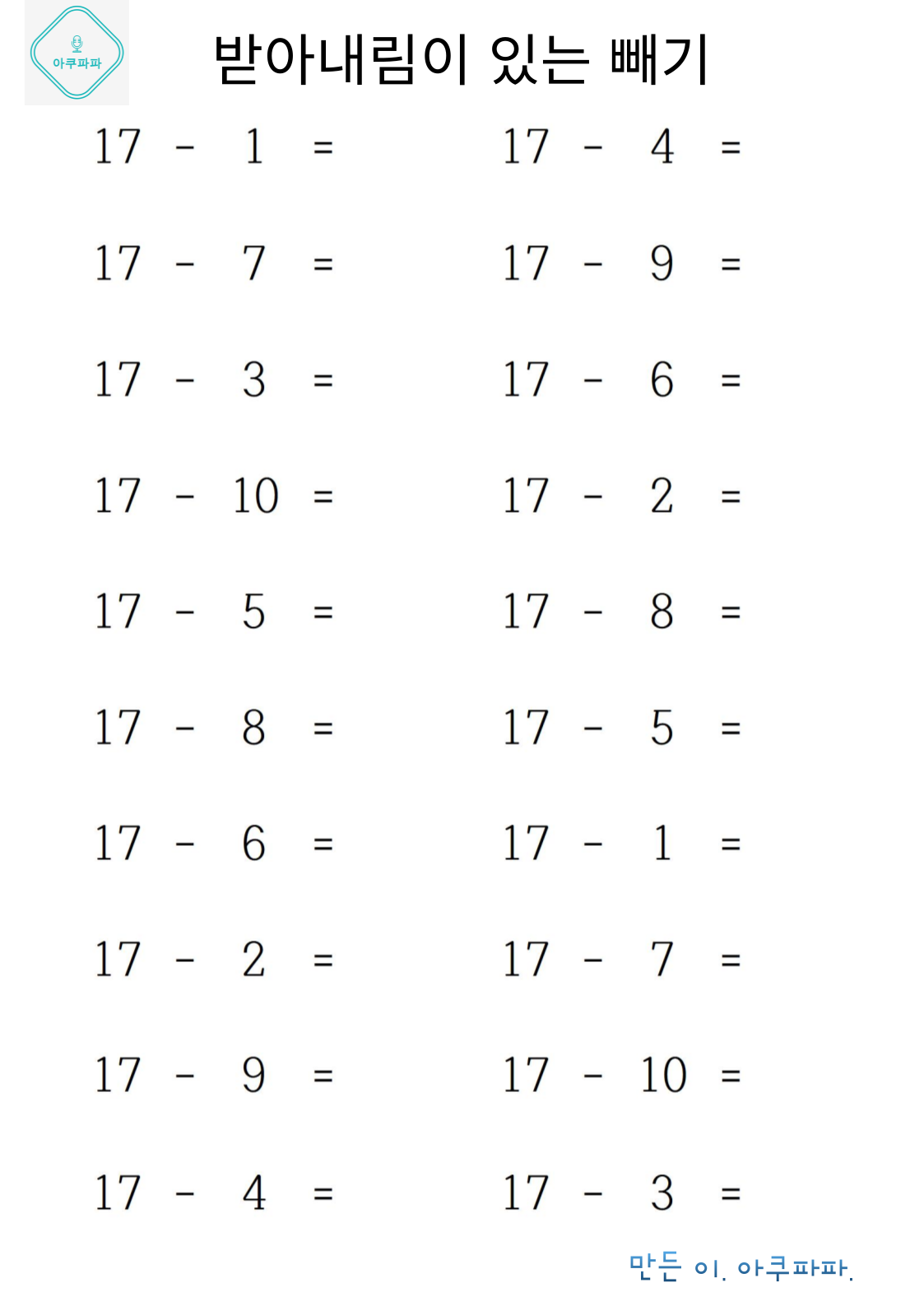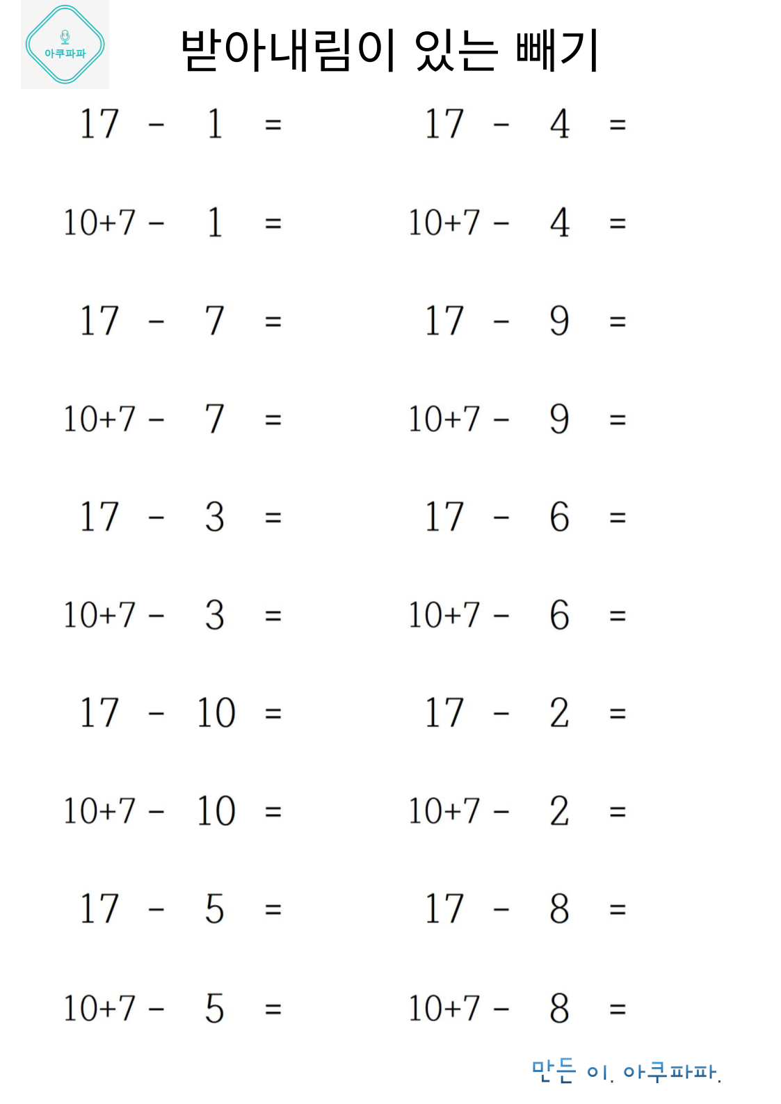 기본 개념을 익히는 차원에서 n=m, n>m 의 숫자도 포함 되어있으니 참고해 주세요. (ex: 15-5, 17-5 등)