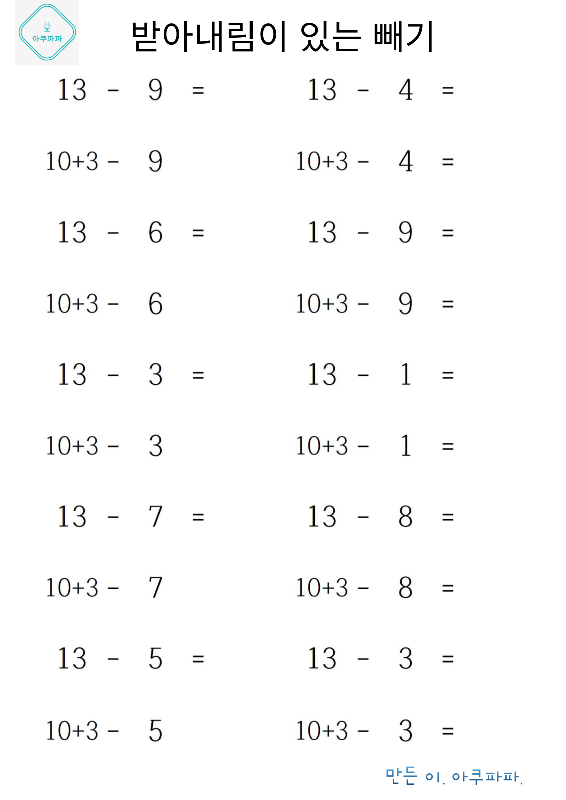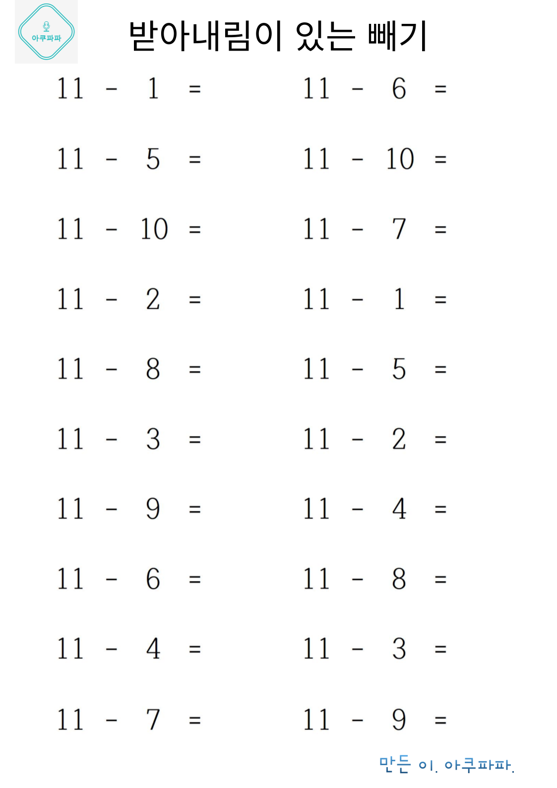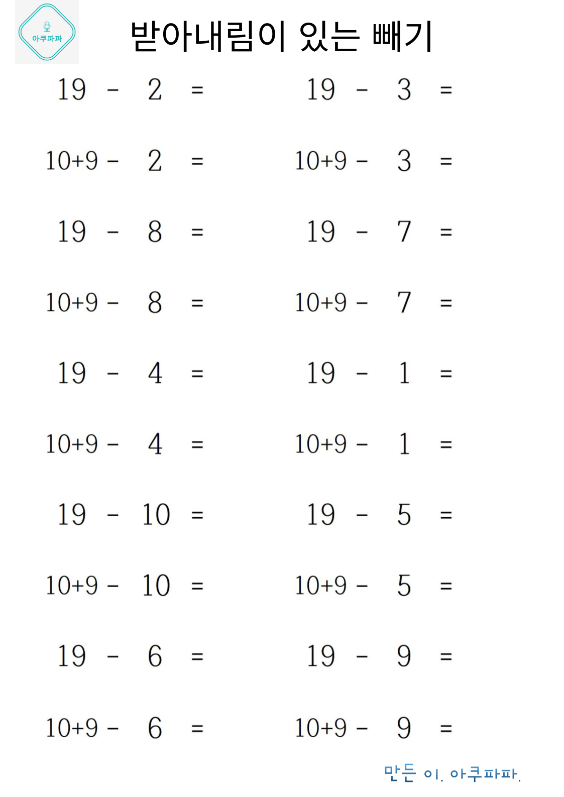 10 - 1 부터 19 - 9 까지 십몇(1n) - 몇(m) 의 계산을 기본으로 만들었습니다.