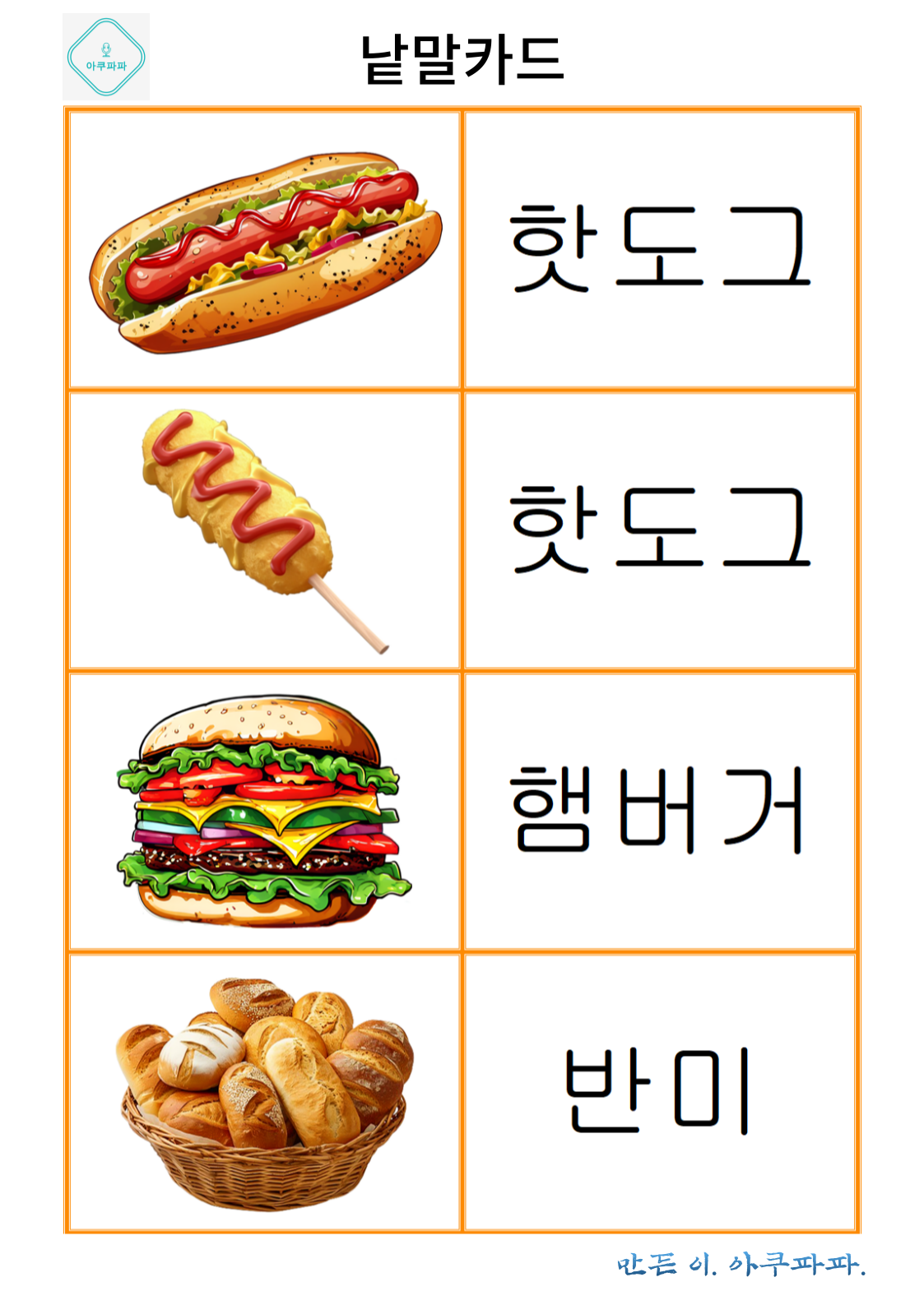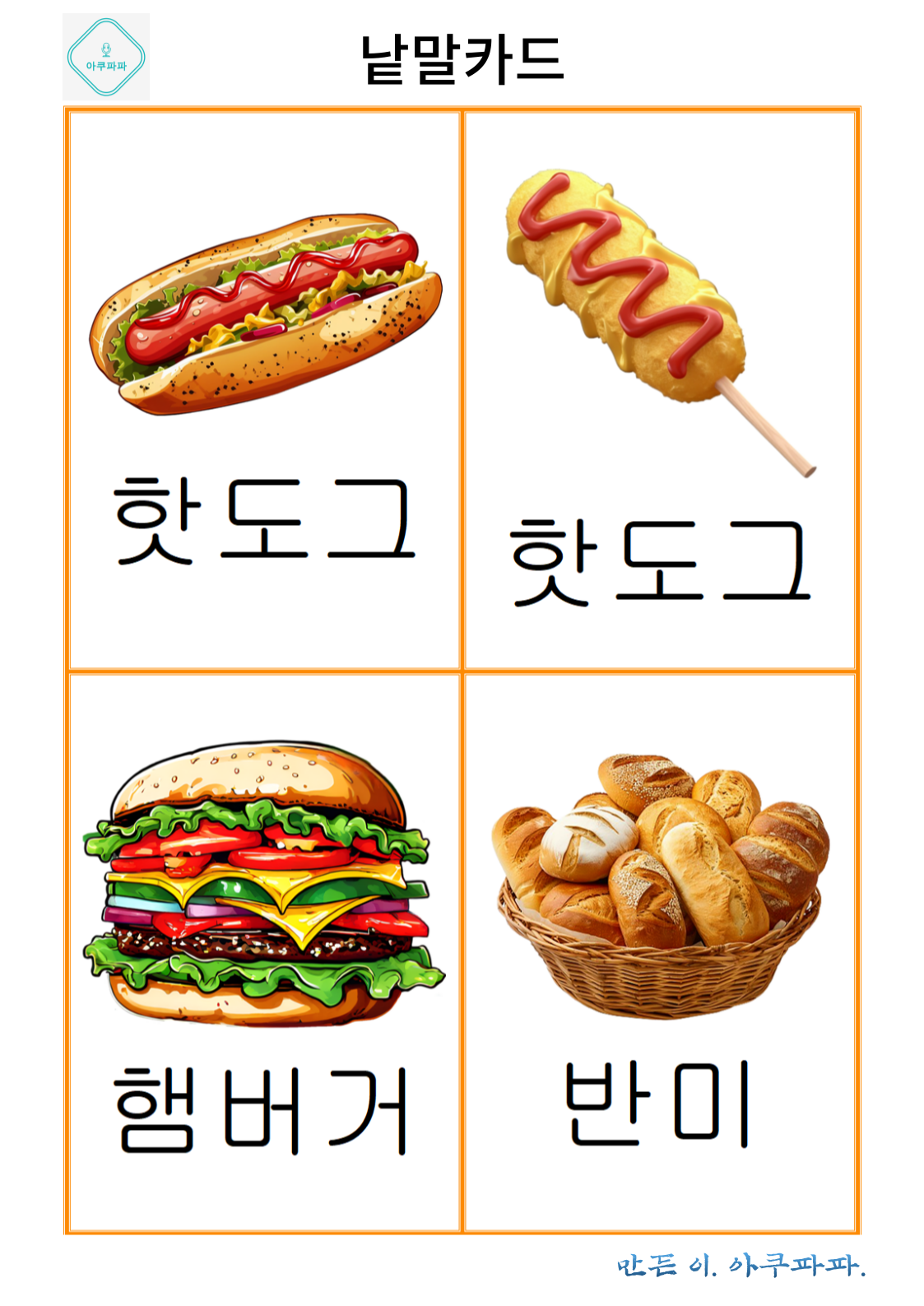| 낱말 카드 놀이(word card game) - 음식(Food)2 (0) | 2024.04.27 |