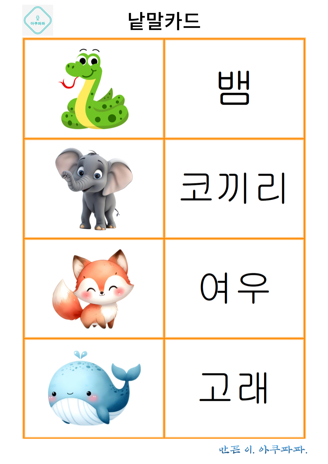 낱말 카드 놀이(word card game) - 동물(animal) 1