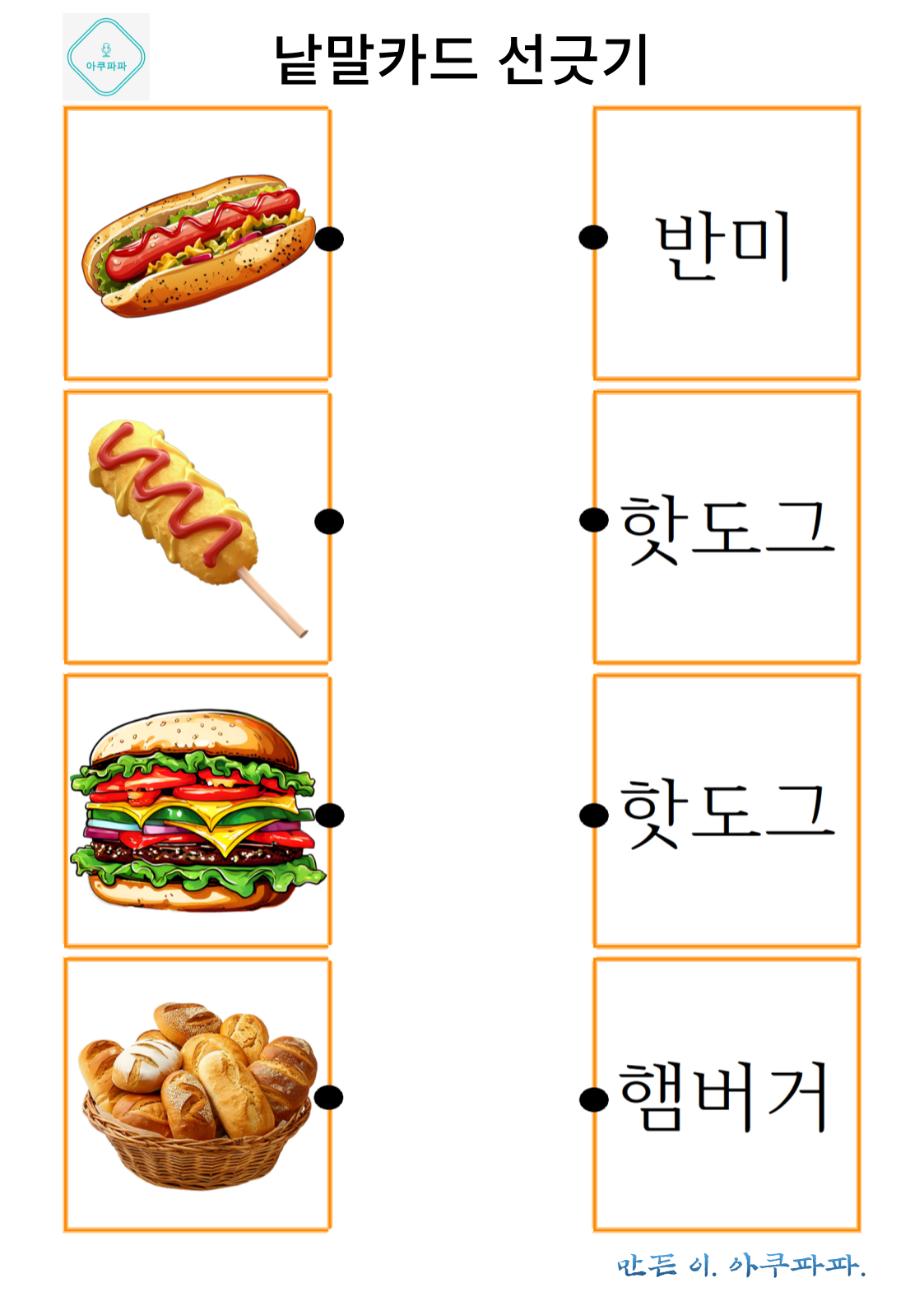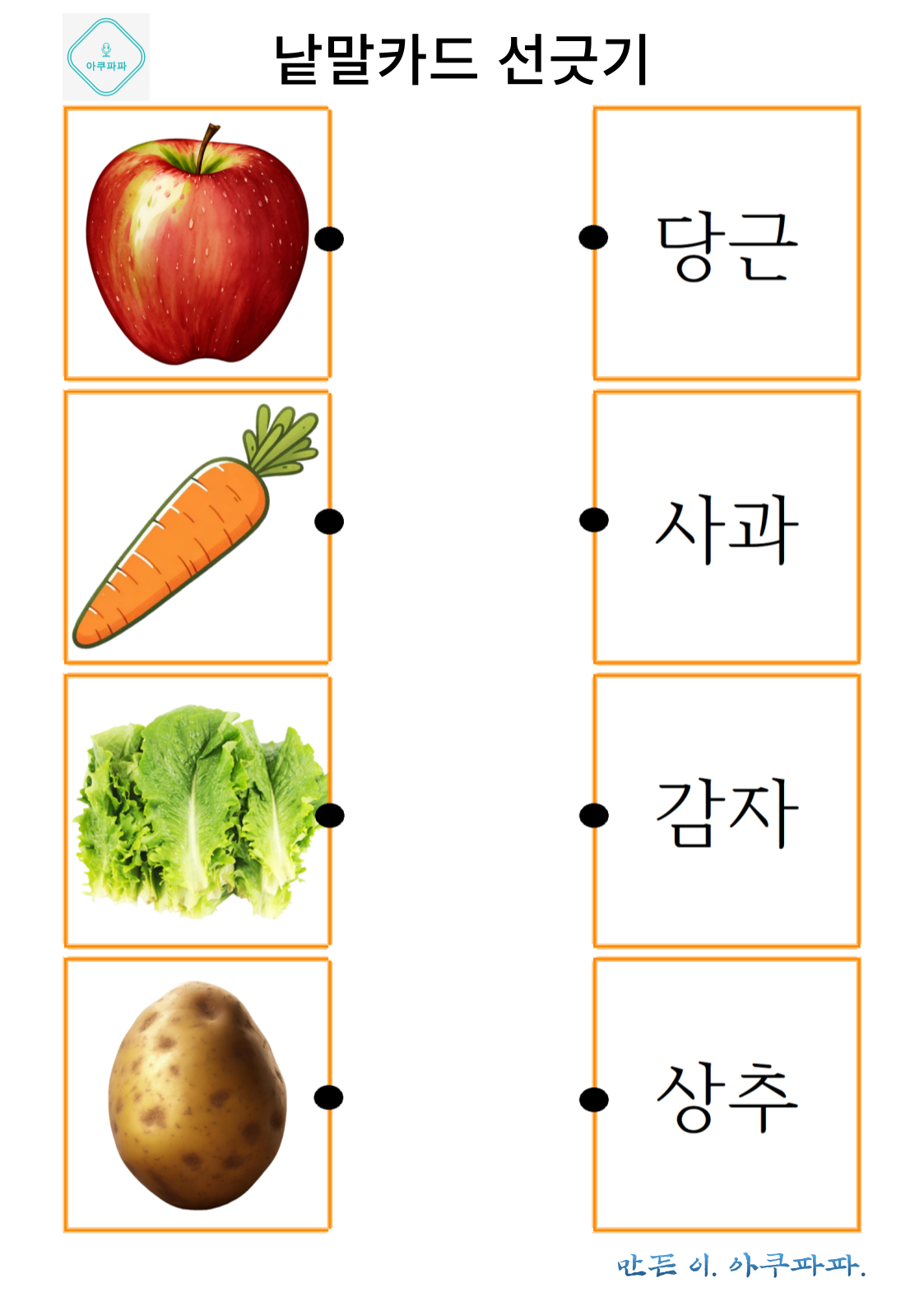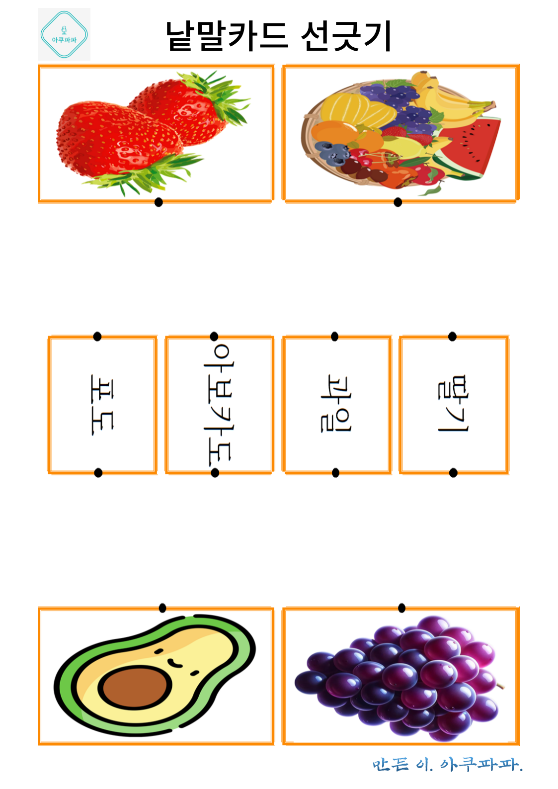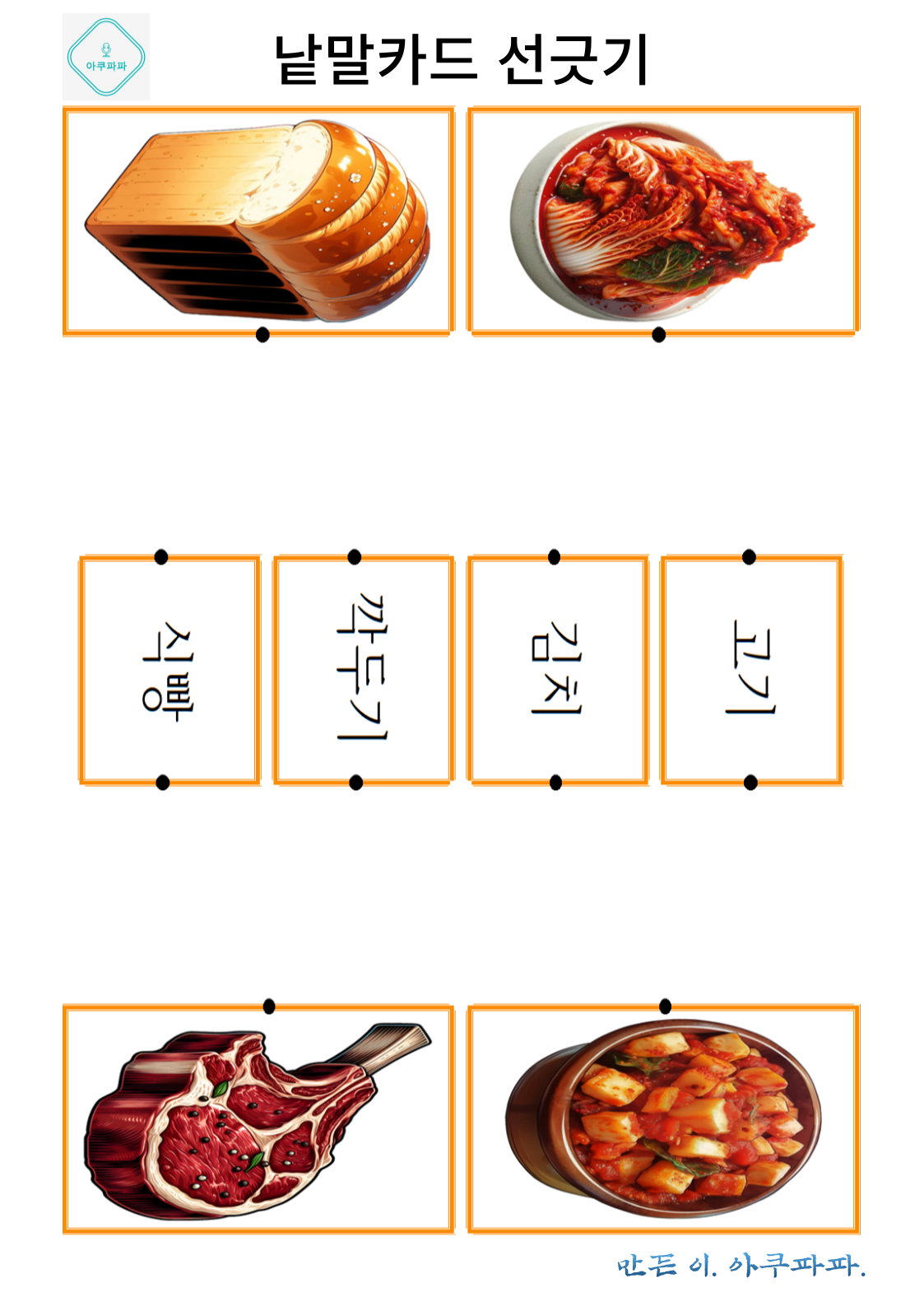 그림으로 배우는 낱말 카드 놀이 a picture-learning word card game 안녕하세요. 아쿠파파 입니다. Hello, I'm Acupapa. 그림과 함께 적혀있는 낱말 카드를 이용해 Use the word card that's written