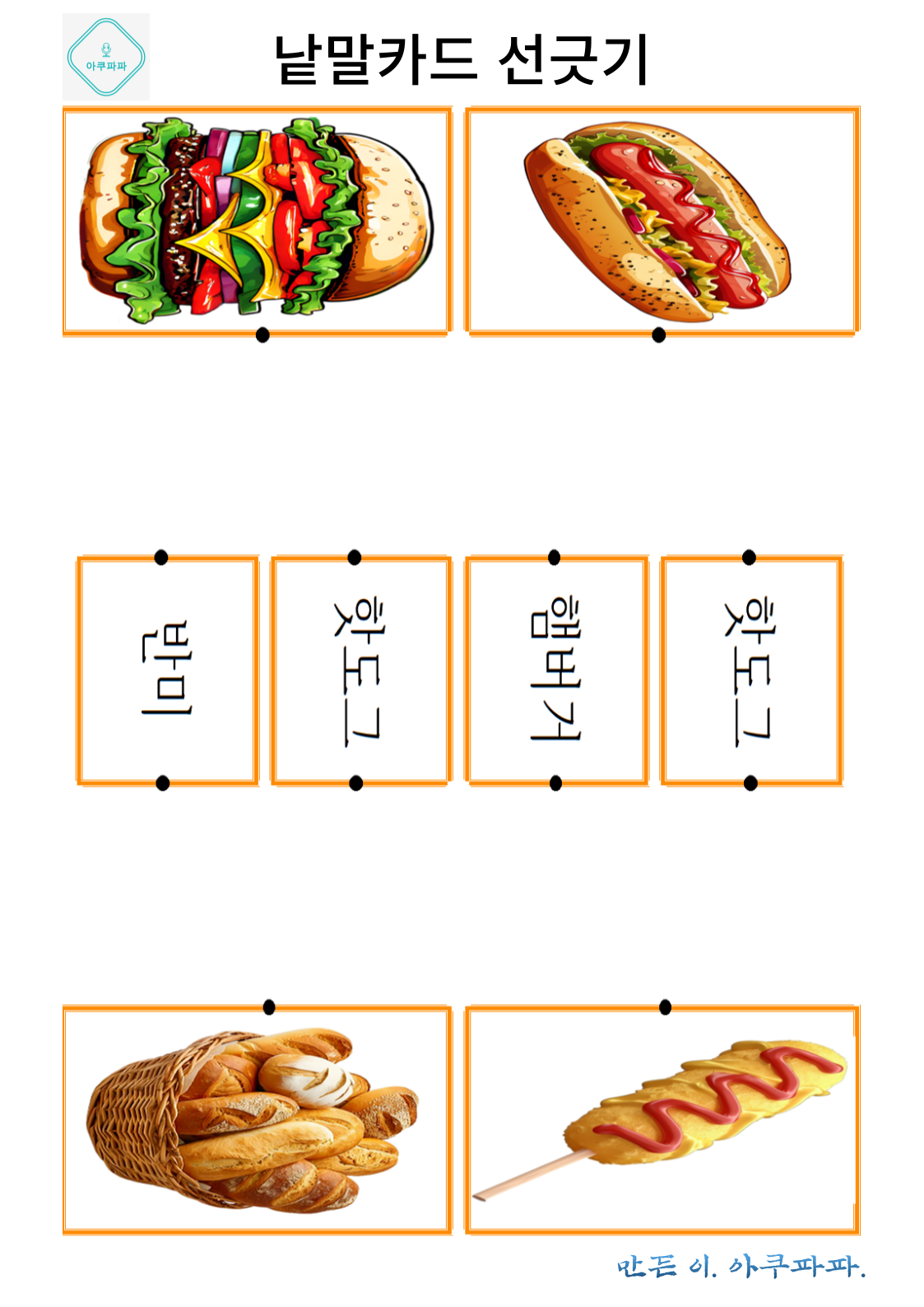 | 낱말카드 선긋기(Drawing a line of word cards) - 음식(Food) 2 (0) | 2024.05.03 |
