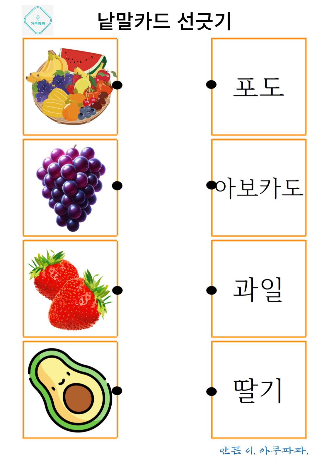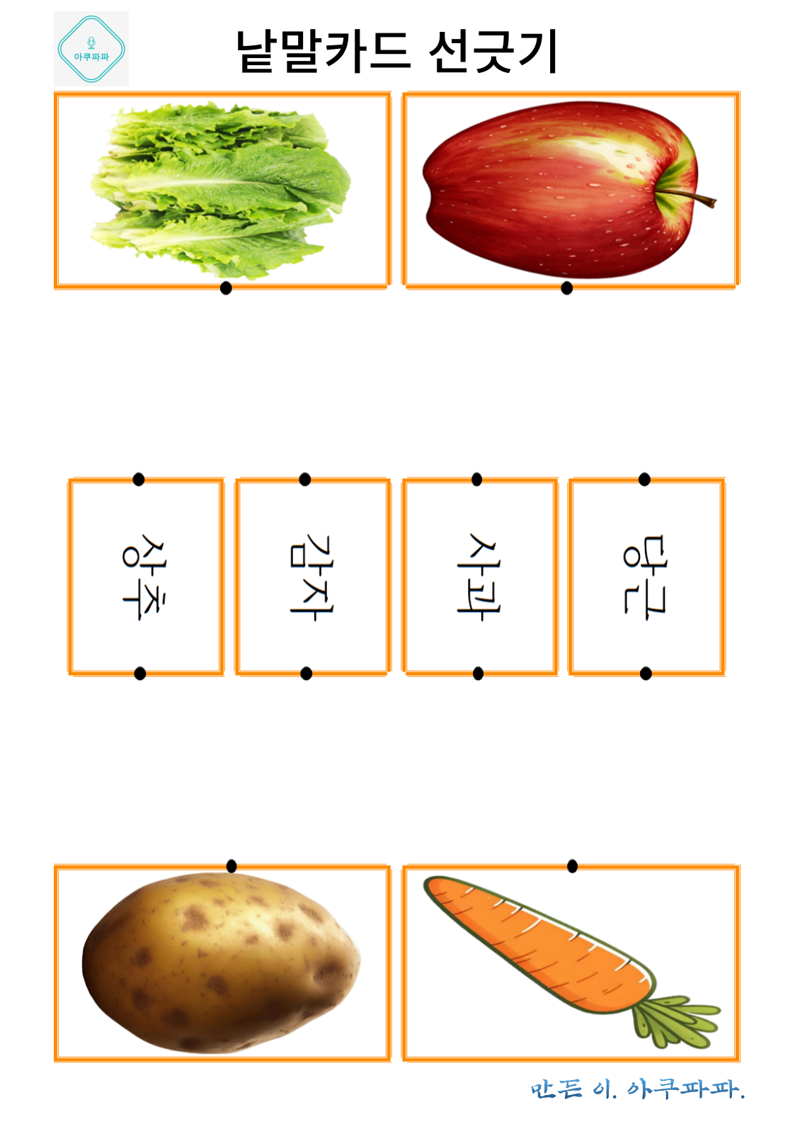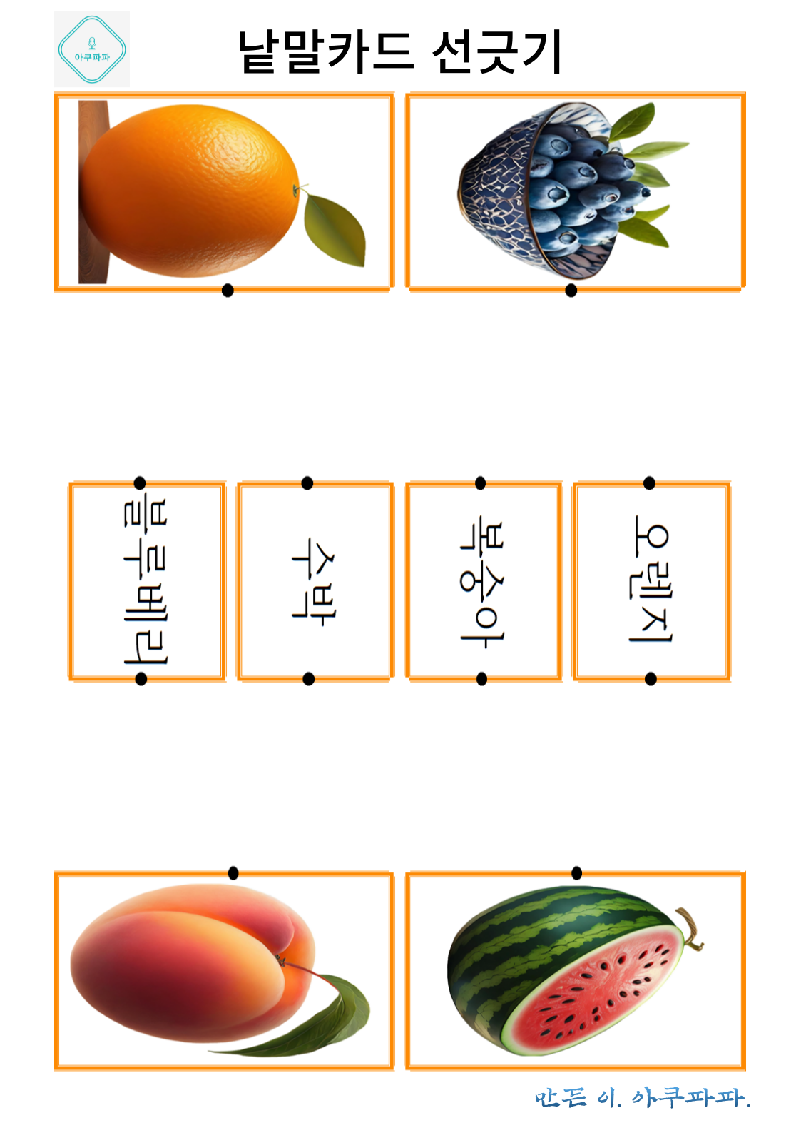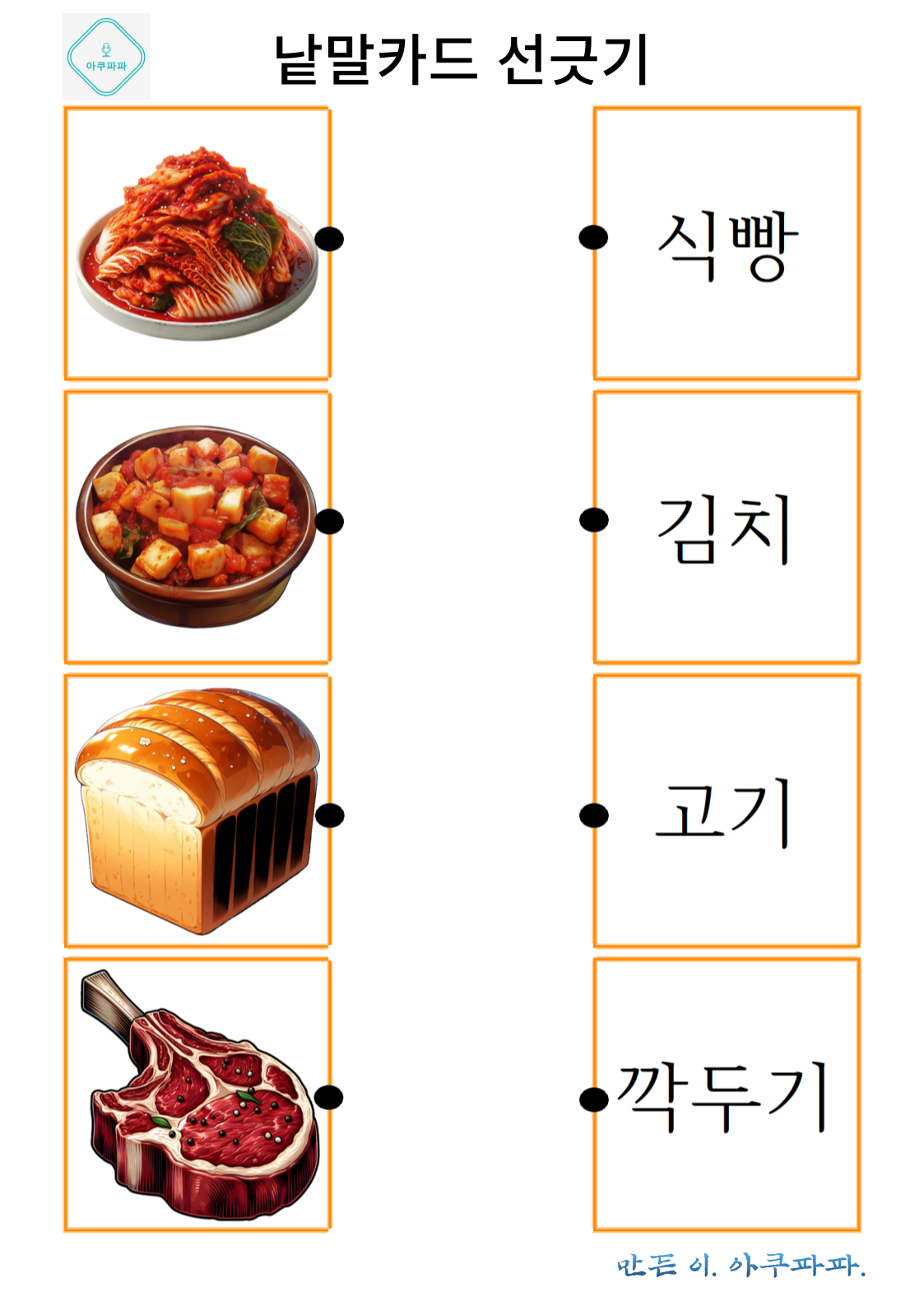 그림으로 배우는 낱말 카드 놀이 a picture-learning word card game 안녕하세요. 아쿠파파 입니다. Hello, I'm Acupapa. 그림과 함께 적혀있는 낱말 카드를 이용해 Use the word card that's written