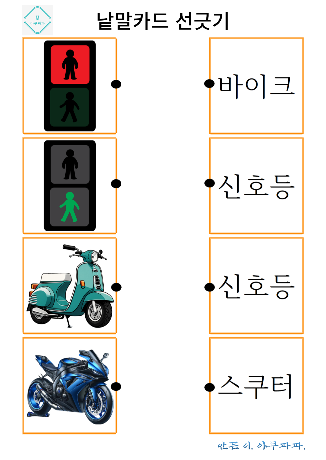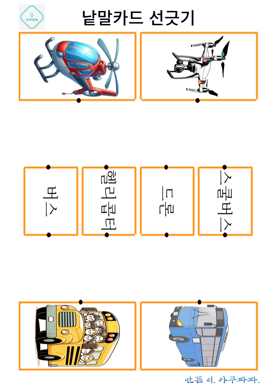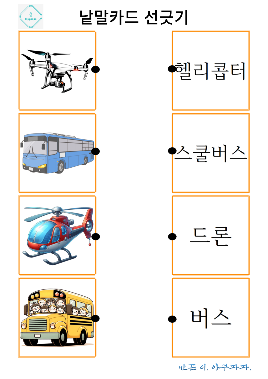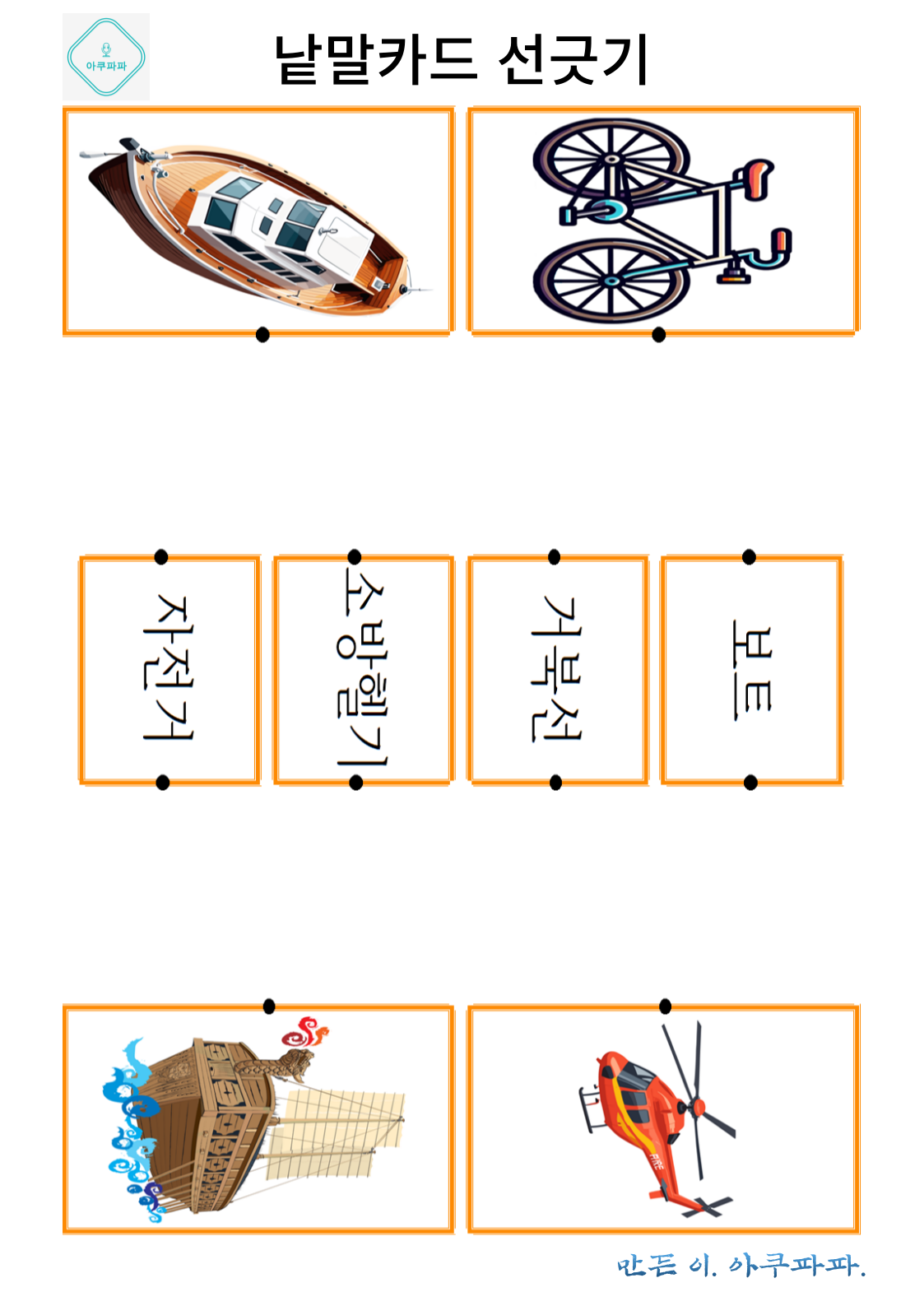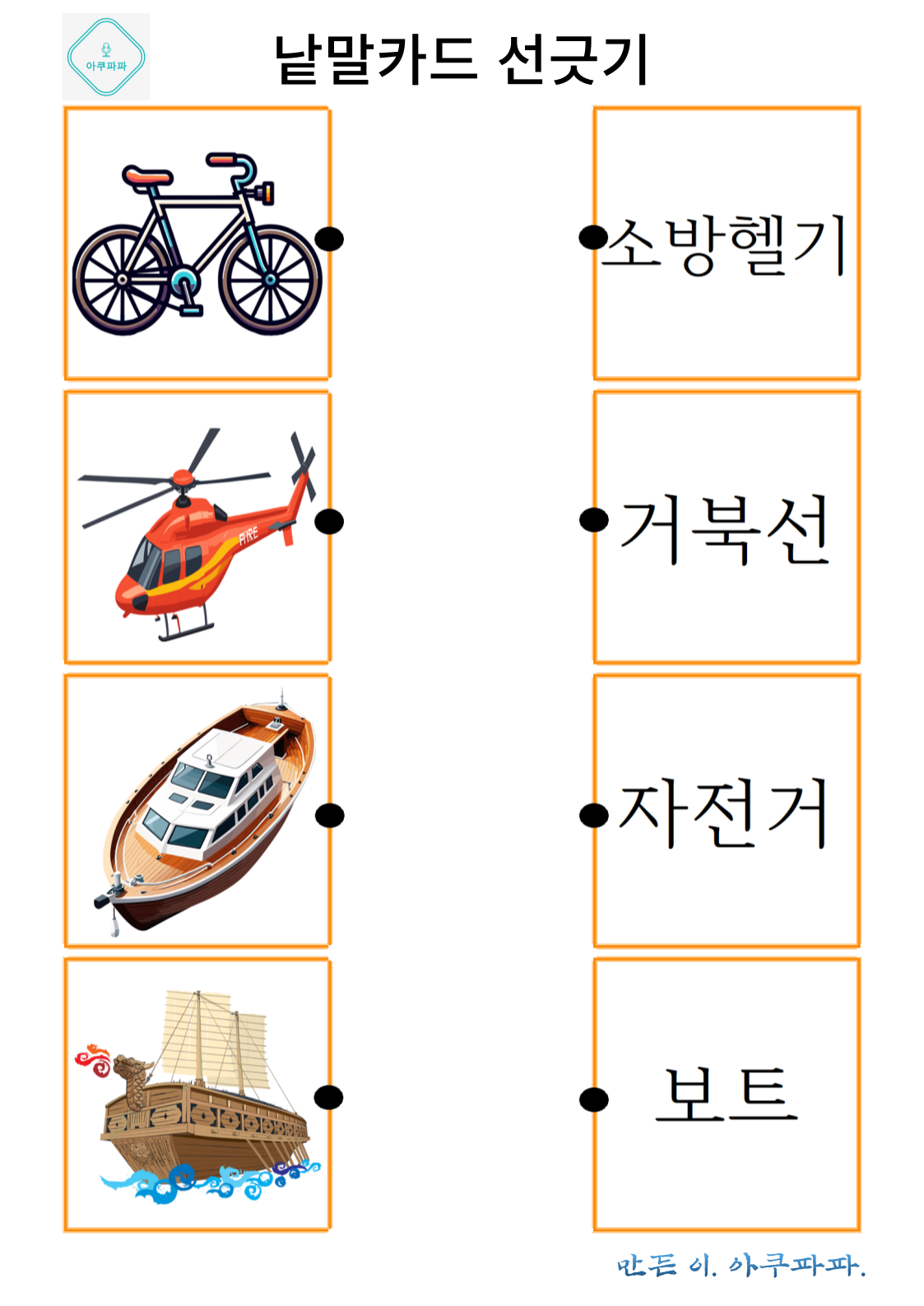 | 낱말카드 선긋기(Drawing a line of word cards) - 탈것(Vehicle) 1 (0) | 2024.05.03 |