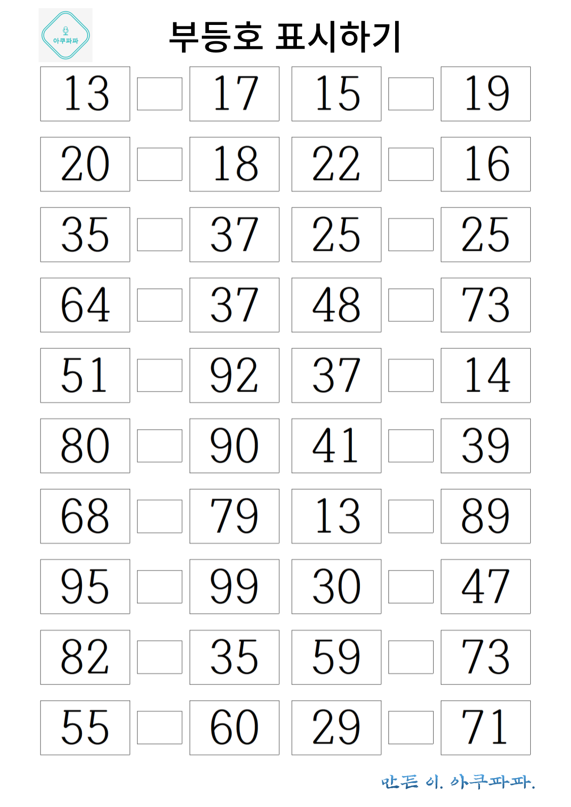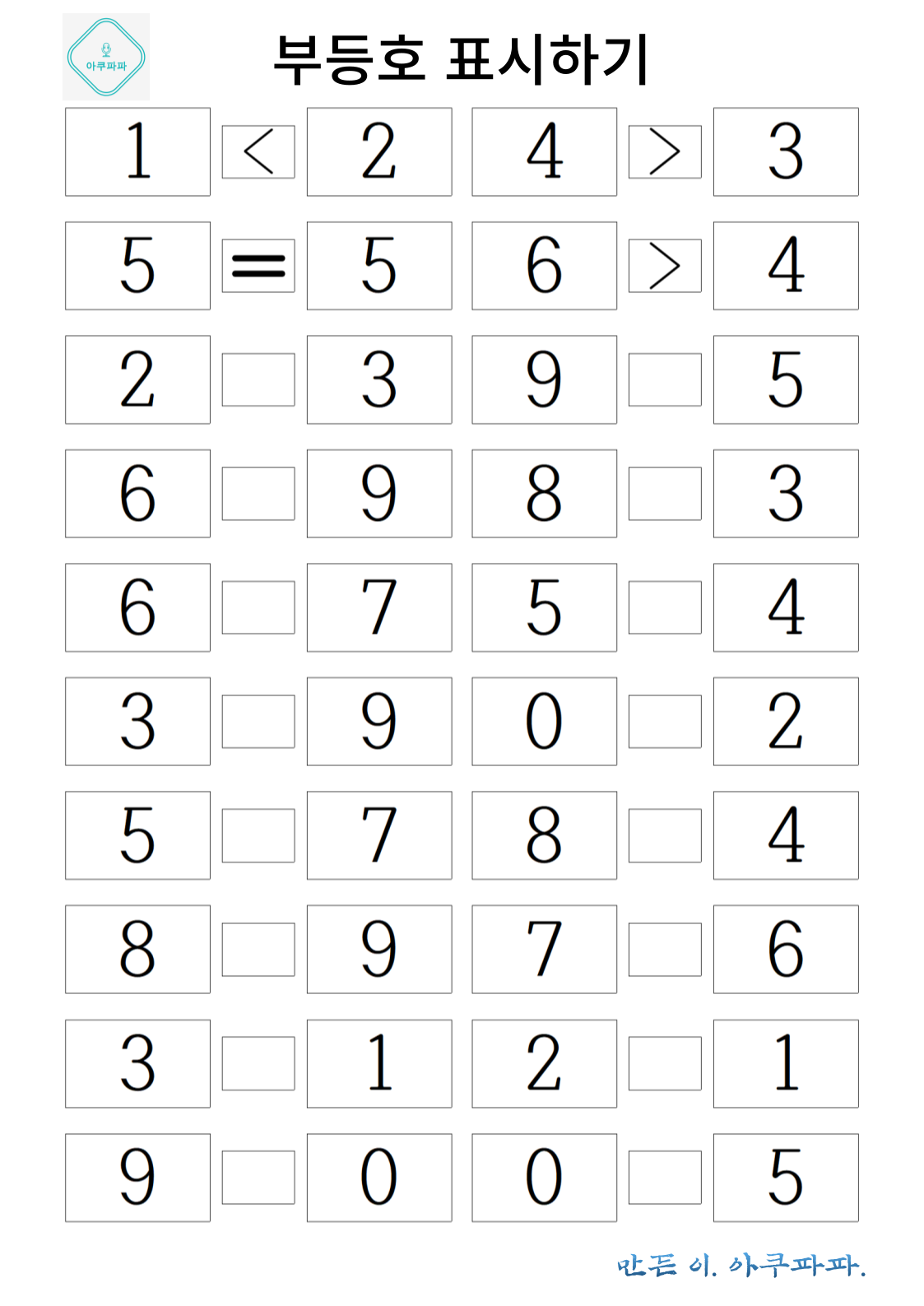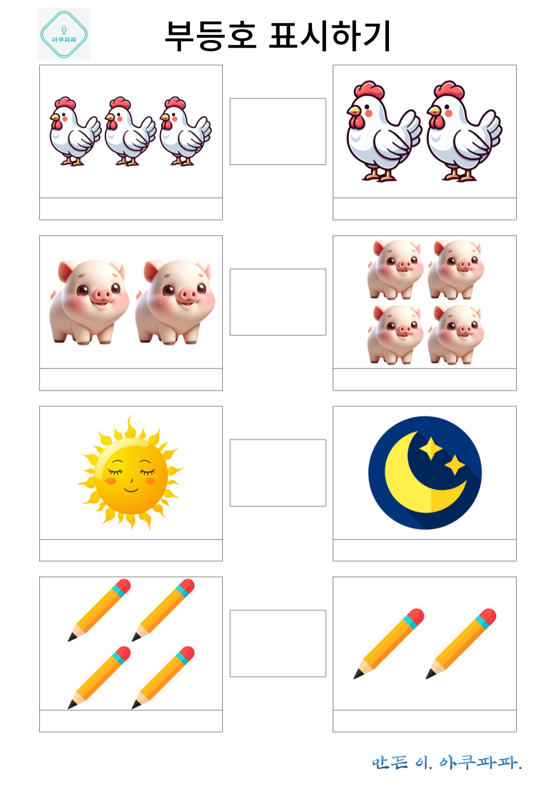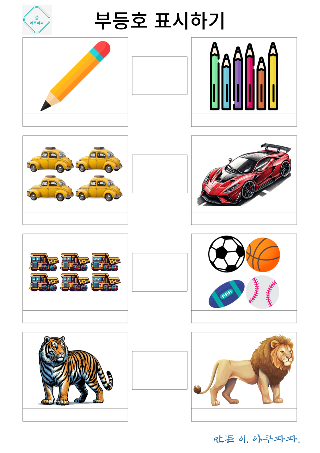 크다와 작다 혹은 많다와 적다 해당하는 부등호를 이용해 수의 크기를 비교해 봅니다.