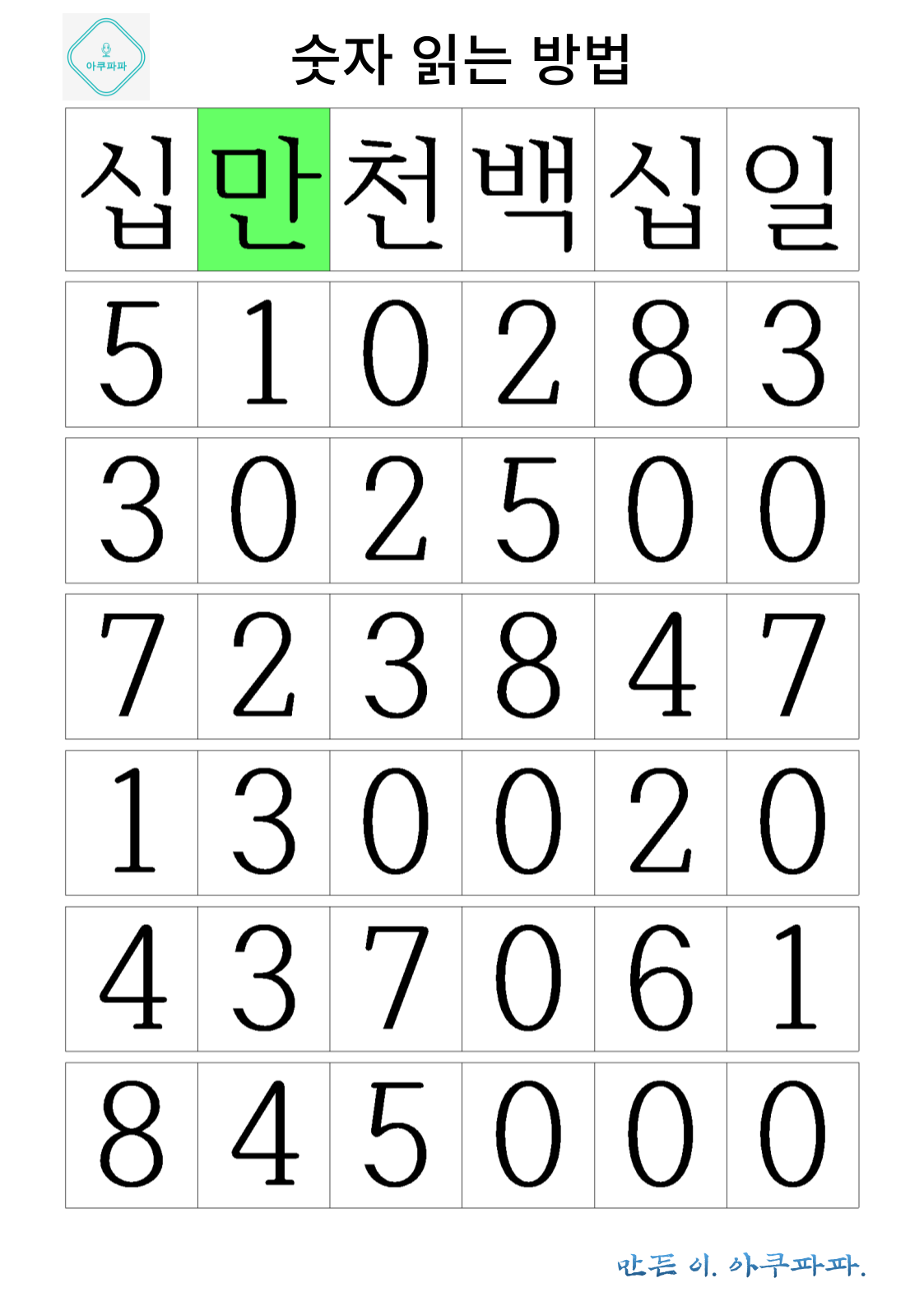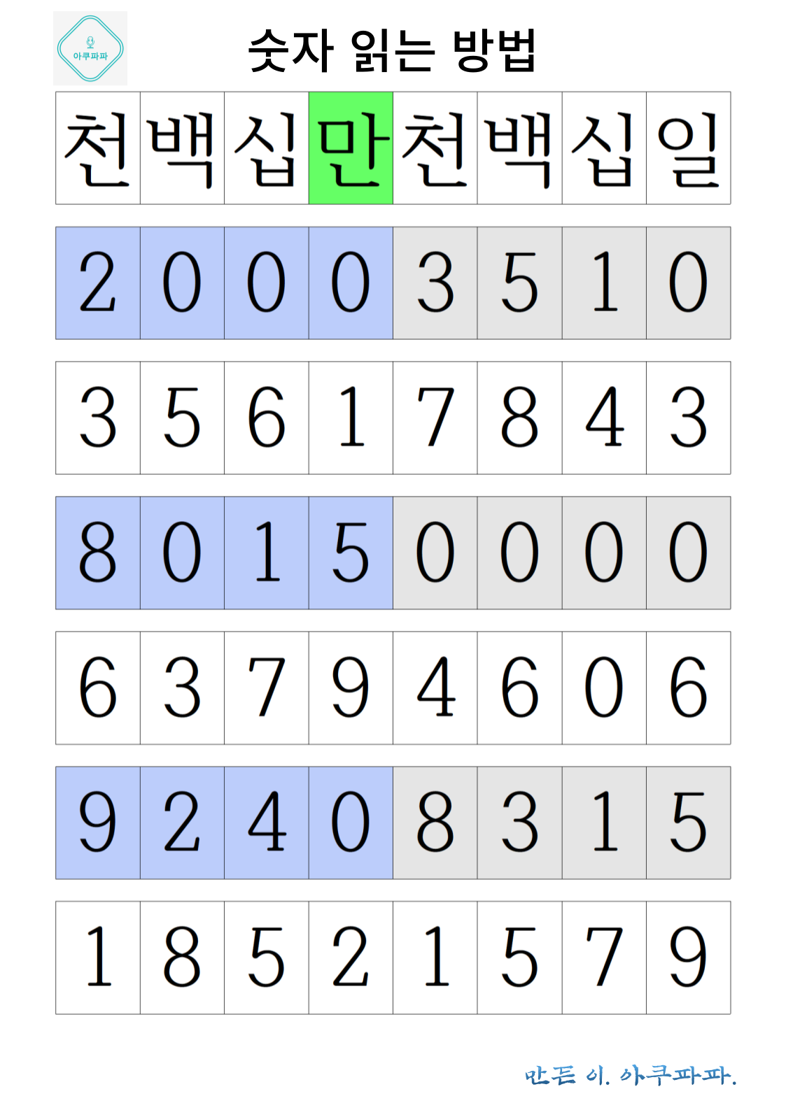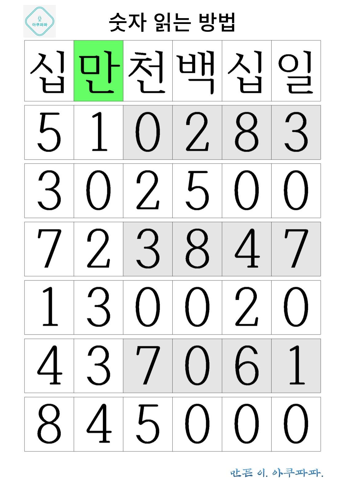 맨위 칸에 해당하는 숫자 단위가 한글로 쓰여져 있습니다.