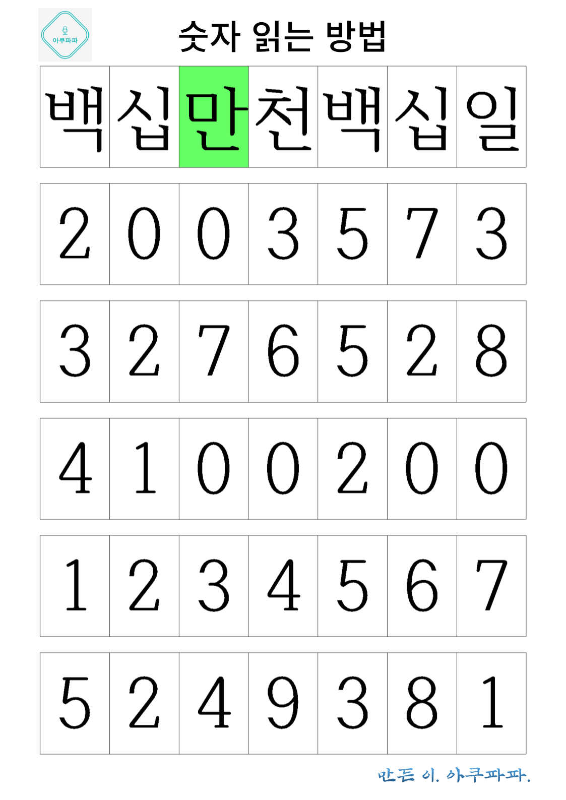 아이들이 아직 많이 접하지 않을 숫자들의 단위에 따른 이름을 배워보는 것으로,