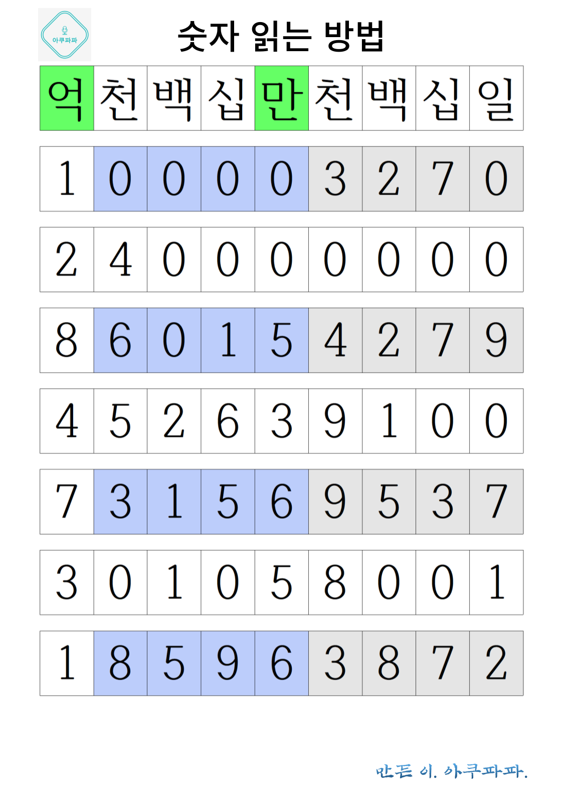 십억 이상의 수가 있을 때 방식은 동일하며, 몇 번 읽고 연습하면 쉽게 할 수 있을거에요.